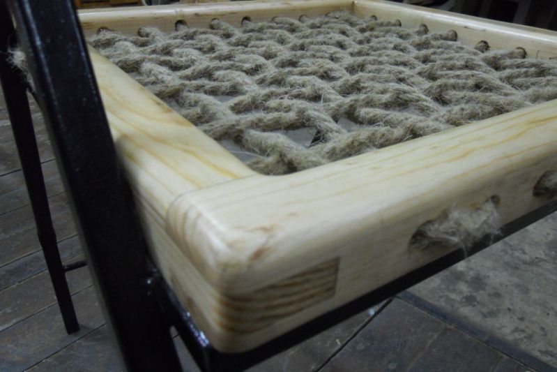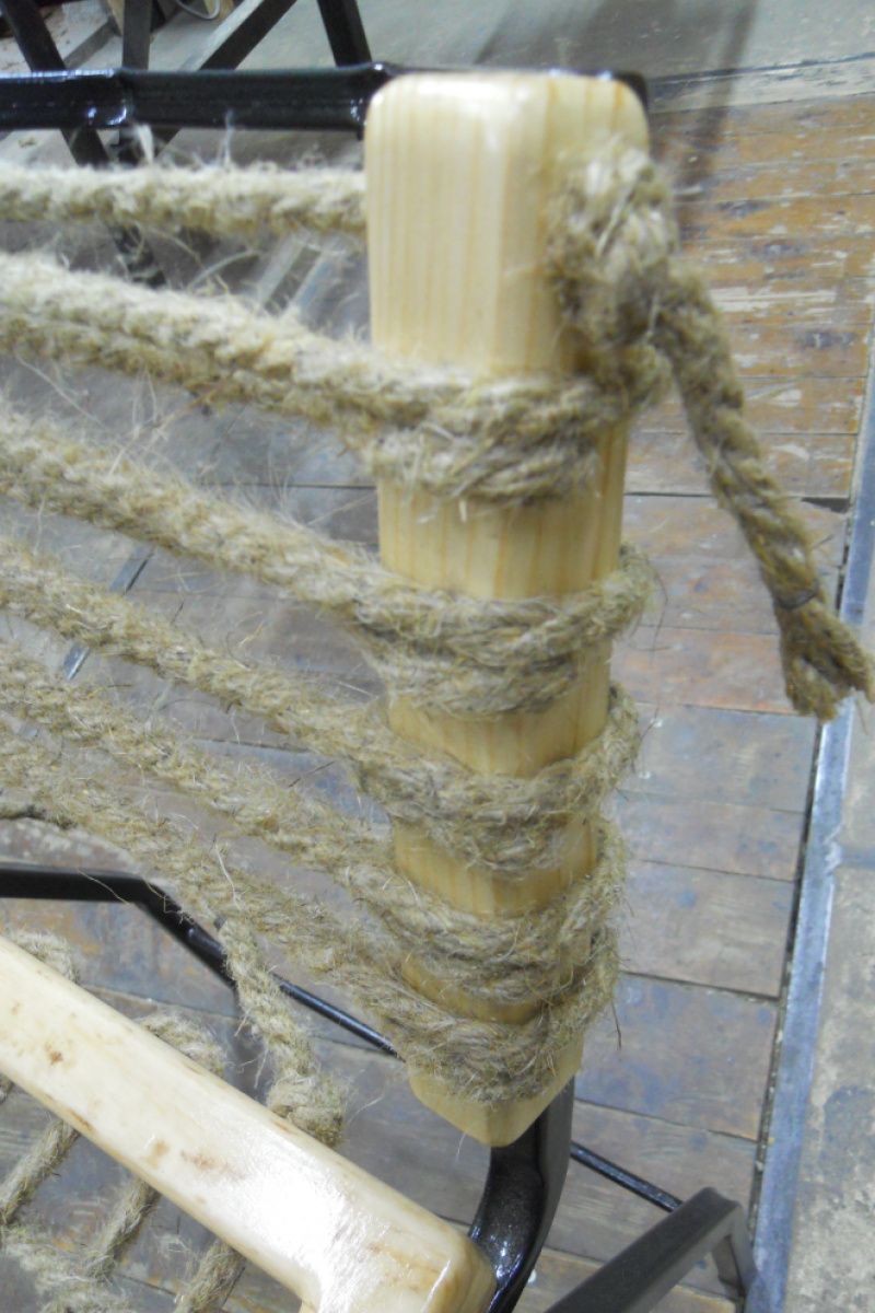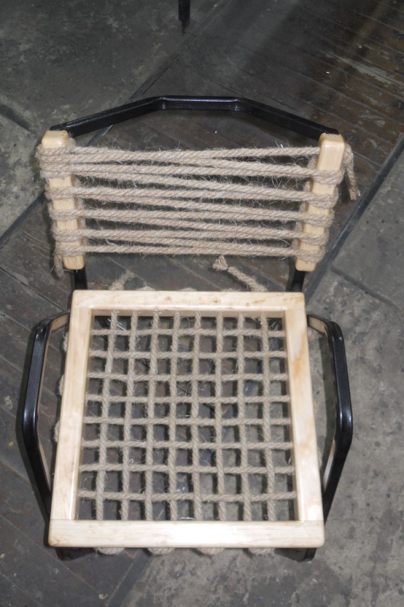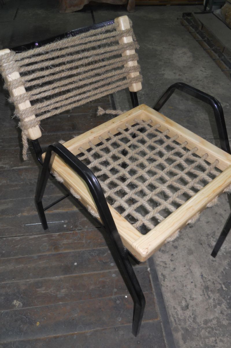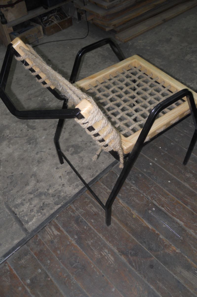 Кресло сделано из металлического профиля толщиной 2 мм, окрашено краской с молотковым видом и рамкой из соснового бруса 40*40 мм, сетка выполнена из веревки из льна. размер рамки с сеткой 46*46 см высота сиденья 48 см высота спинки 78 см