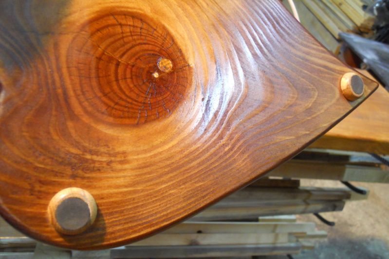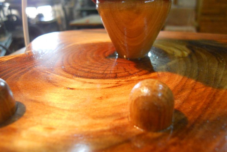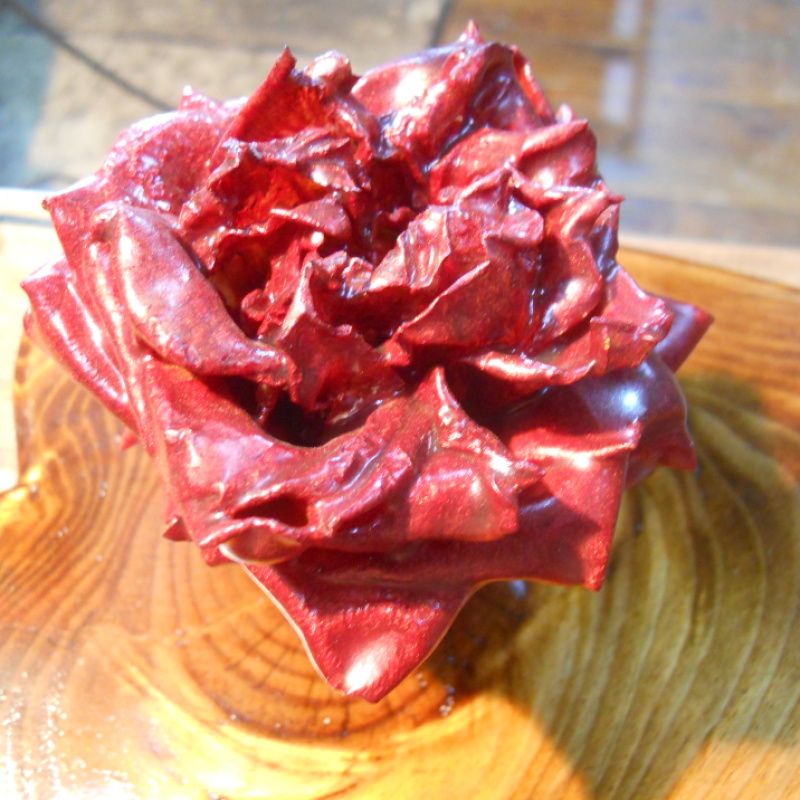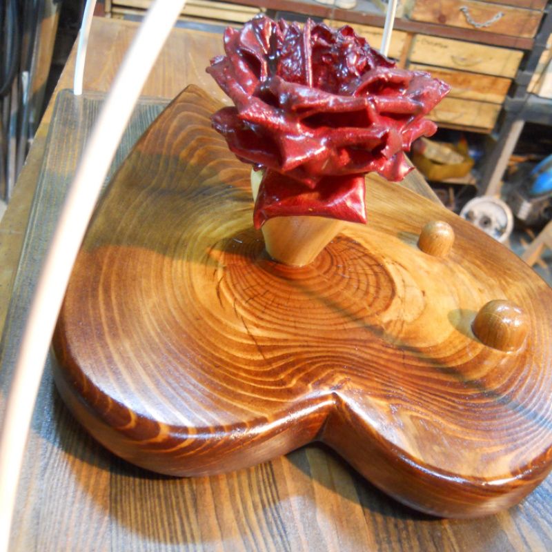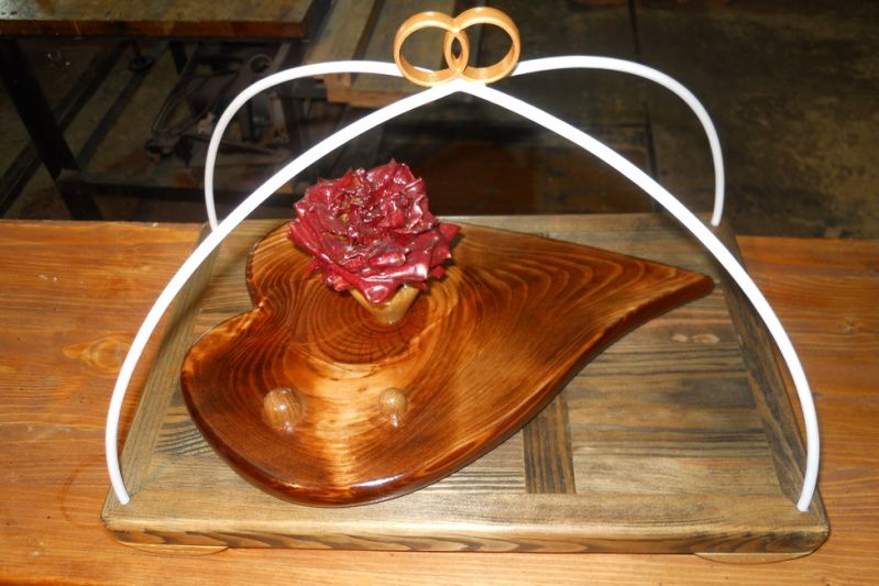 Подставка для колец с настоящей розой окрашенной в красный цвет и обернутая в прозрачный полиэфирный пластик и зафиксирована тем же пластиком в маленьком вазоне из акации, который прикреплен на сердце из сосны с красивым естественным рисунком из колец. Сердце стоит на подставке из сосны, накрытой металлическим каркасом с кольцами на вершине.
