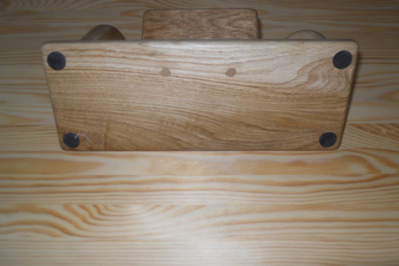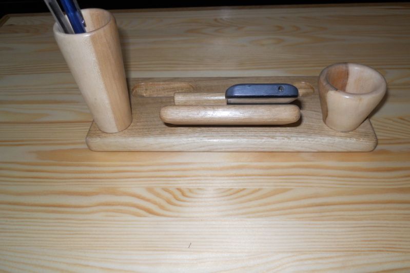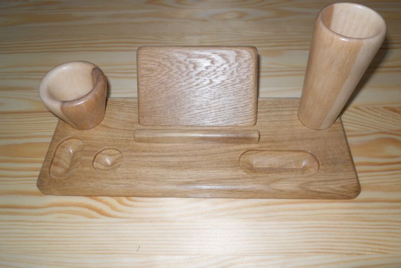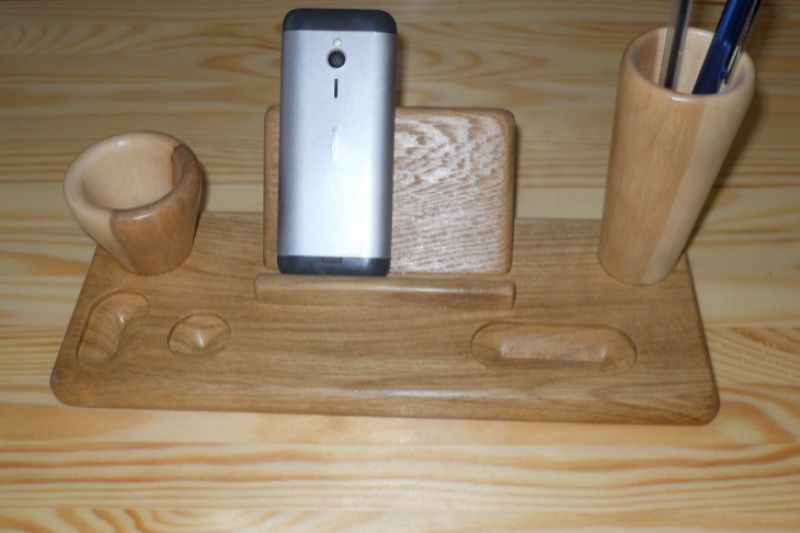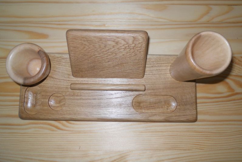 Подставка-органайзер сделана из двух пород древесины. Основание подставки сделано из дуба, в котором сделаны отверстия для мелочей и установлена многоцелевая опора для телефона, визиток или бумажек, для карандашей изготовлены уникальные чаши из канадского клена, взяв его середину с переходом цвета от светлого к темному.