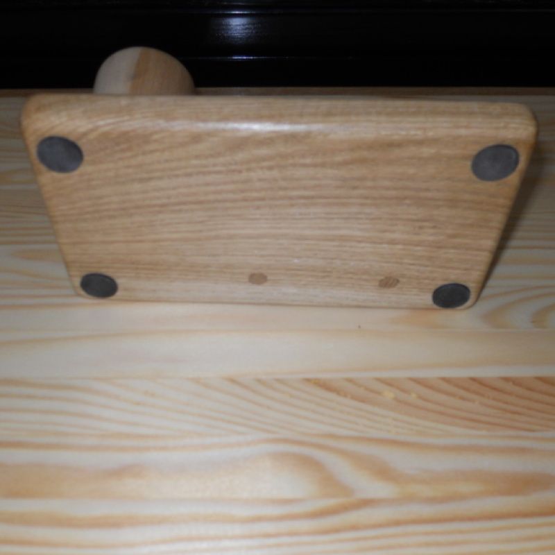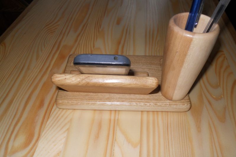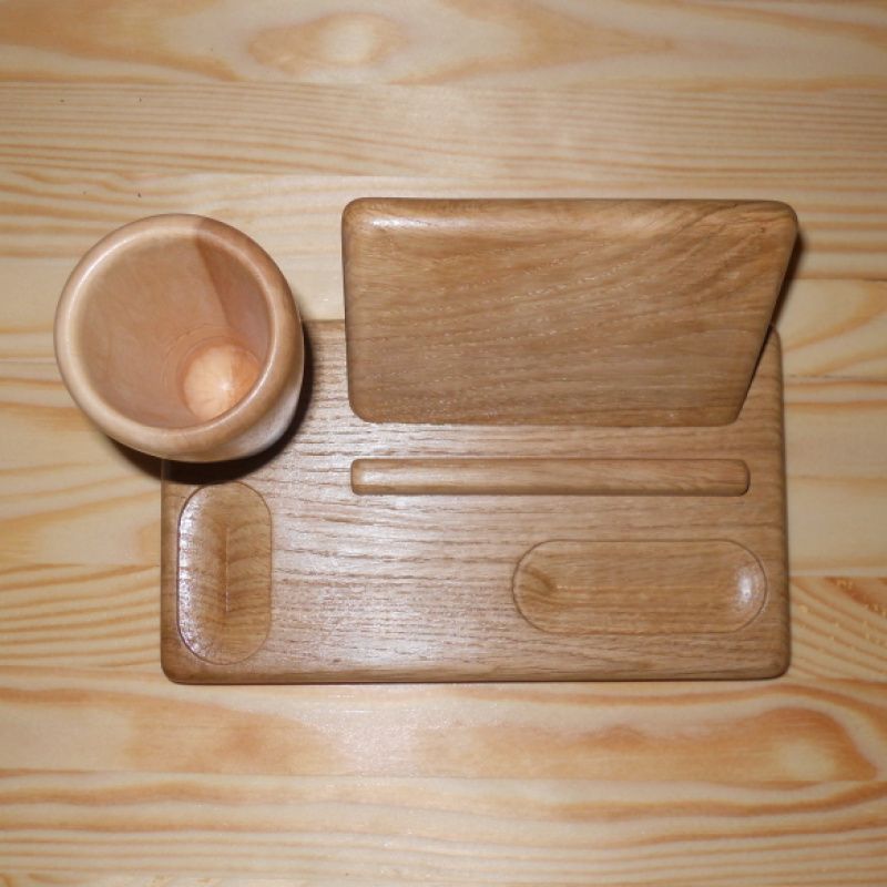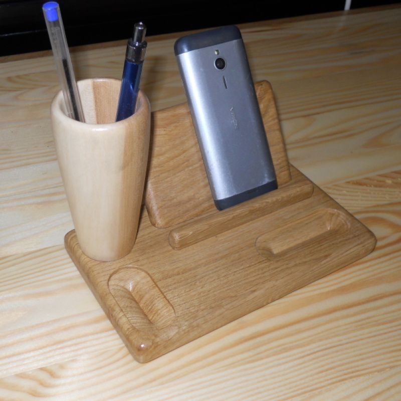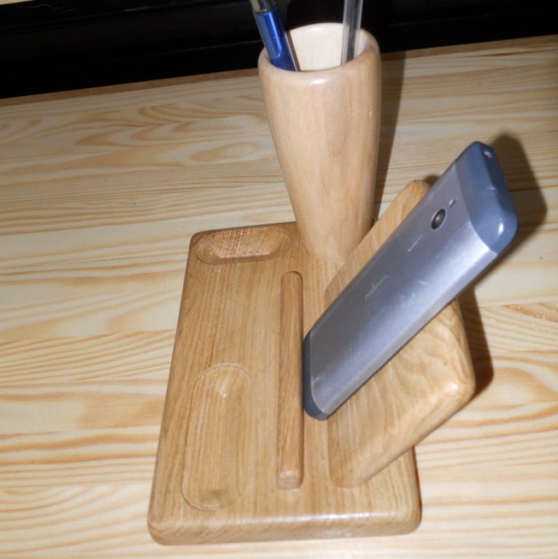 Подставка-органайзер сделана из двух пород древесины. Основание подставки сделано из дуба, в котором сделаны отверстия для мелочей и установлена многоцелевая опора для телефона, визиток или бумажек, для карандашей изготовлена уникальная чаша из канадского клена, взяв его середину с переходом цвета от светлого к темному.
