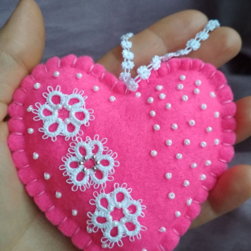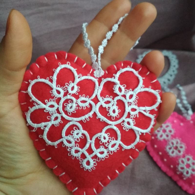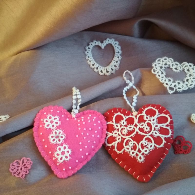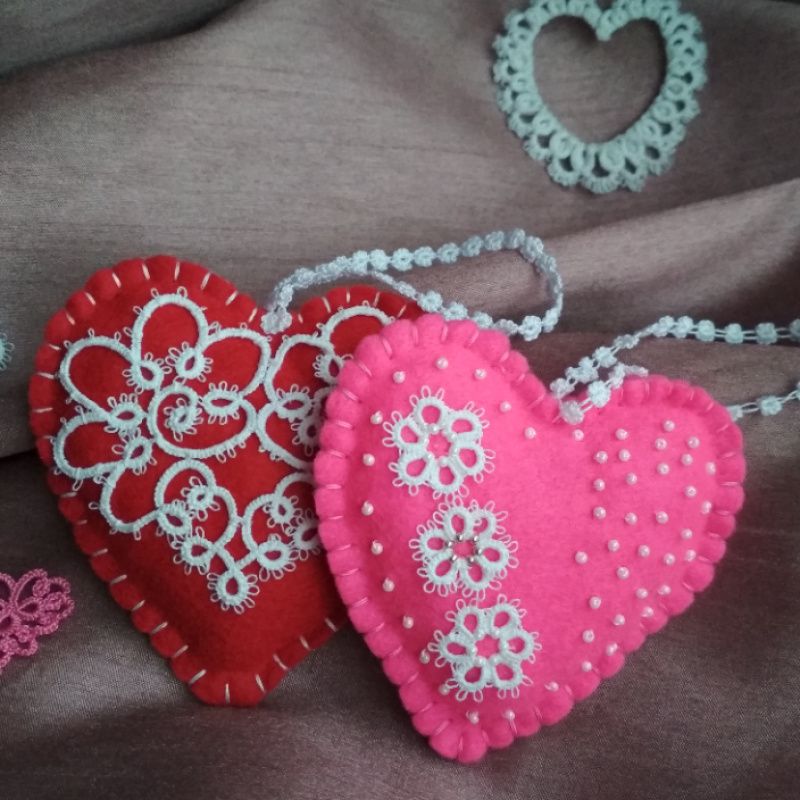 Сердечки из фетра, украшенные кружевом фриволите, мягенькие и очень красивые станут отличным подарком к празднику влюблённых.