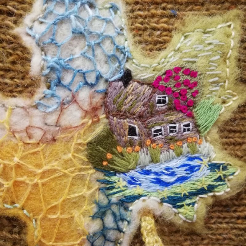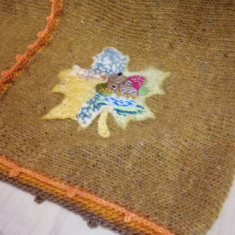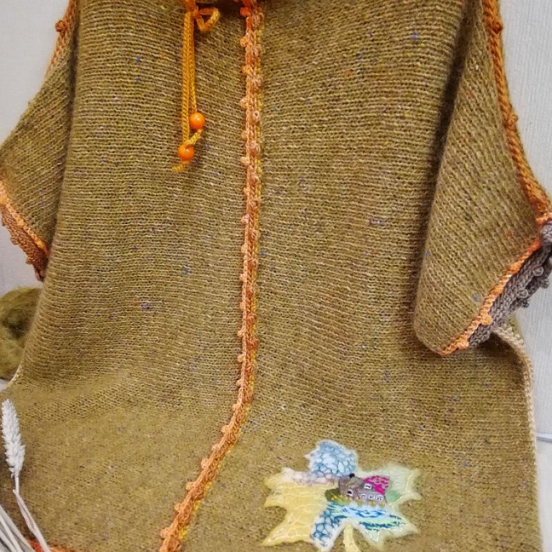 Безрукавка пов'язана спицями, оздоблення гачком, Прикраса-валяний кленовий лист з ручною вишивкою. Англійський твід (меринос 70, мохер 30) і ниточка Кід мохера, колір гірчичний. Ширина 57, висота 65 Догляд-ручне прання в прохолодній воді, віджим можливий машинний 400 об, сушити на горизонтальній поверхні
