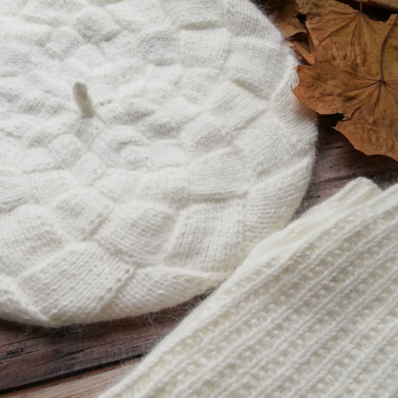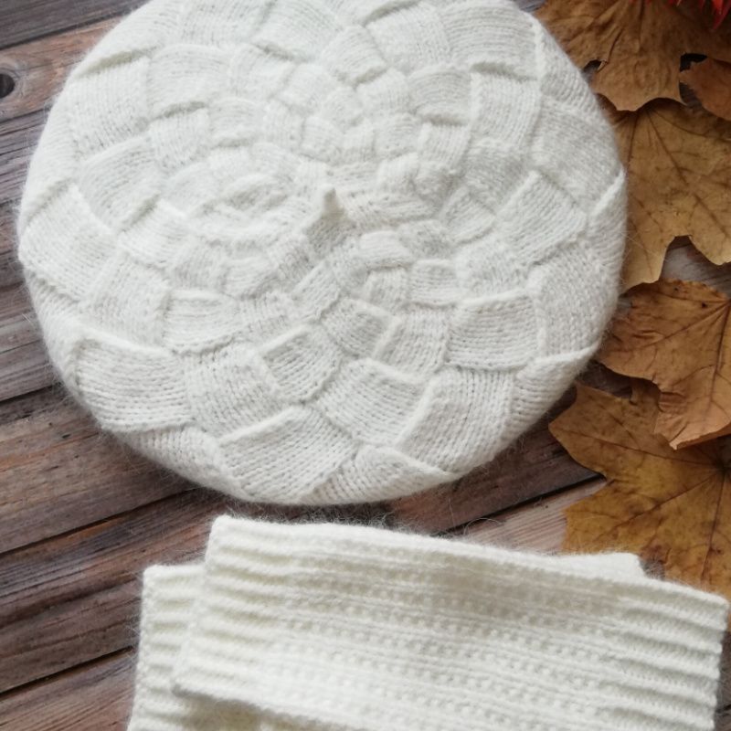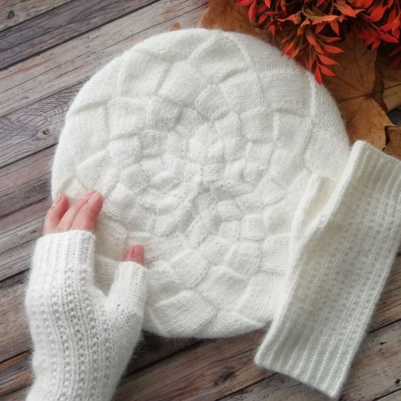 Комплект из митенок и берета связан спицами из пуха норки, цвет белый