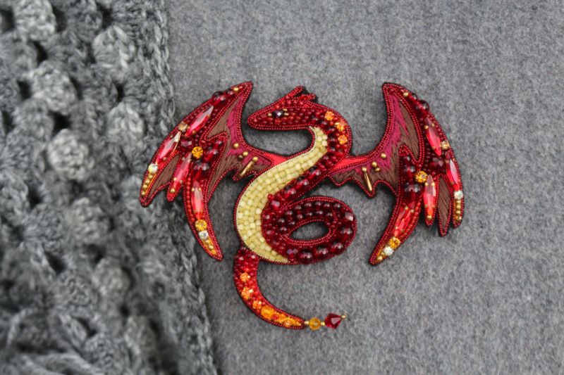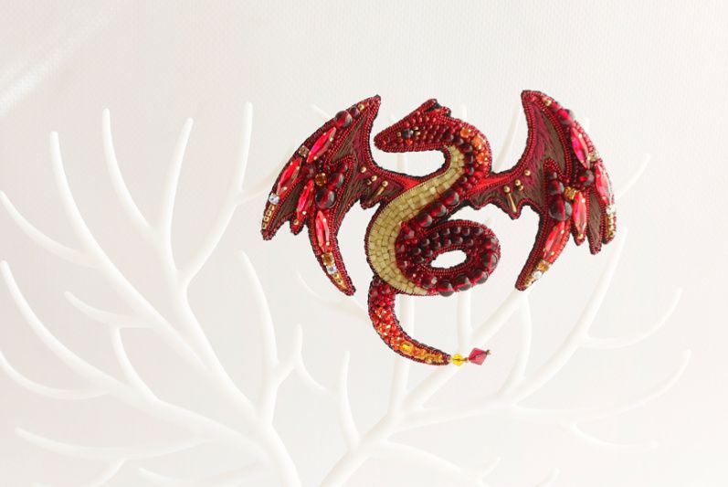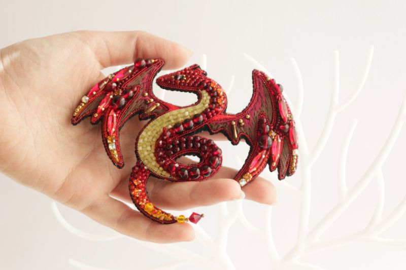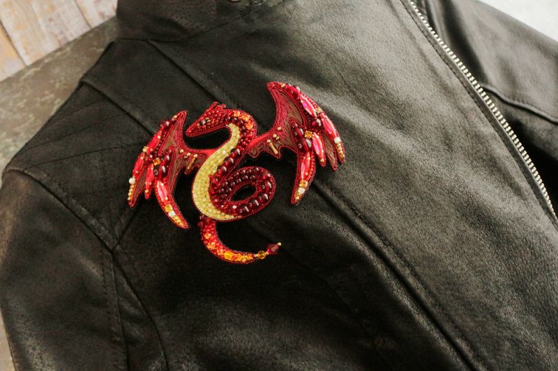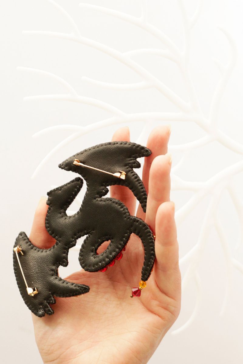 Не стоит бояться заметных аксессуаров - с ними так просто создать яркий образ! А еще бабушка говорят, что они очень эффективны от сглаза ... Как бы там ни было, пламенный дракон олицетворяет сочетание приятного с полезным. Размах крыльев 12 см, высота от ушек до хвоста 10 см. На обороте две булавки на крыльях. Они обеспечивают надежную посадку крылан на одежду. Также дракон поможет свободно соединить две полы кардигана или пиджака (условный пример на последнем фото). Дракон, как настоящий ценитель драгоценностей, щедро украшенный кристаллами, стеклянными и хрустальными бусинами, чешским бисером разных видов. Обратная сторона - натуральная кожа. Брошь упругая, не жесткая - ее можно приколоть к основанию, что будет небольшой изгиб (например, шляпа или очилля, пояс или корсаж), и она не торчать "сама собой". Прекрасно подходит к вязаных или валяных вещей, одежды с ткани не очень плотного плетения из грубых нитей. На плотных тонконитових тканях могут оставаться дырочки от проколов (в основном, такие дырочки исчезают после намачивания ткани, однако этот момент следует иметь в виду). Брошь готова к отправке