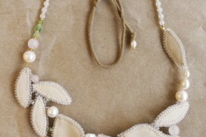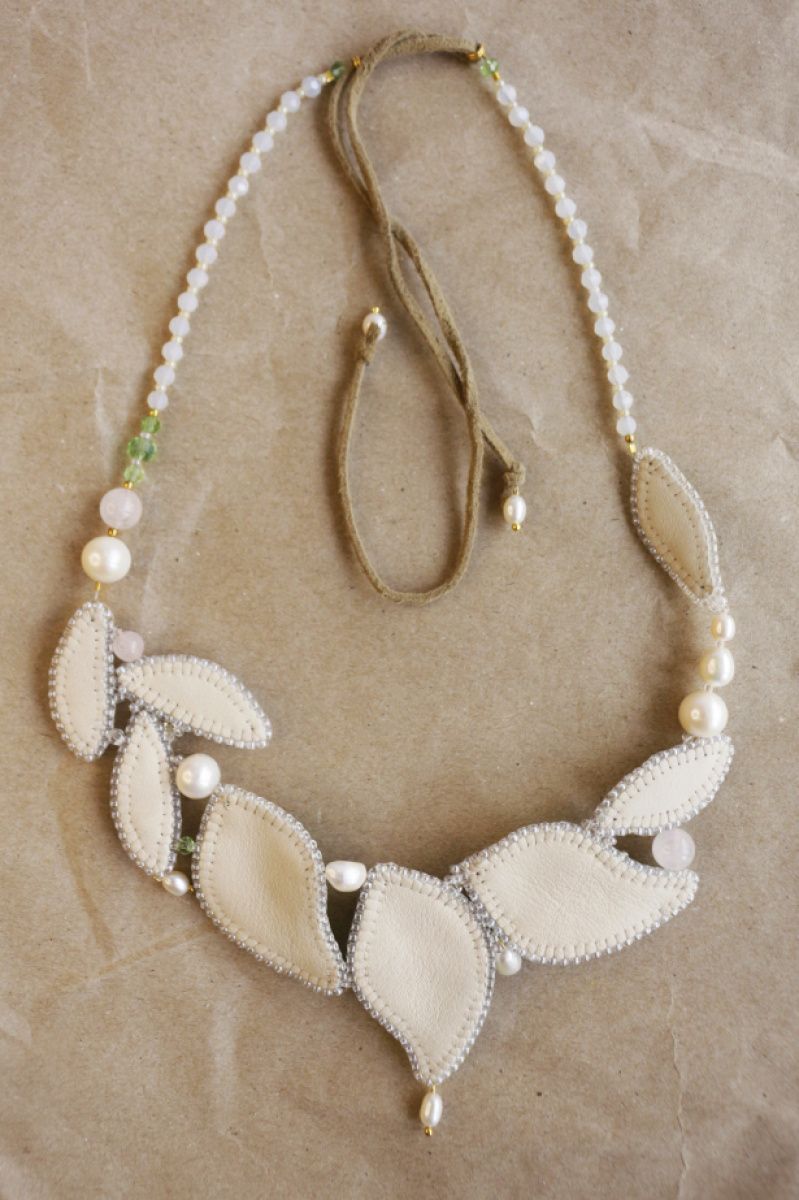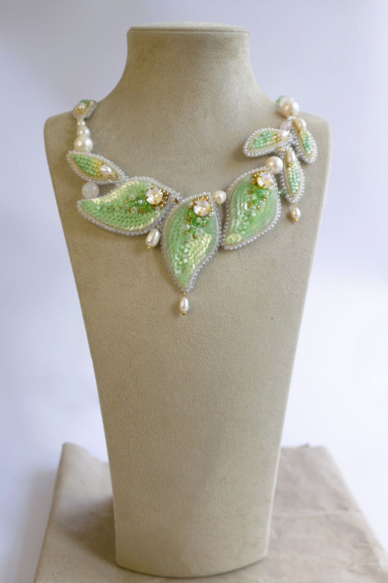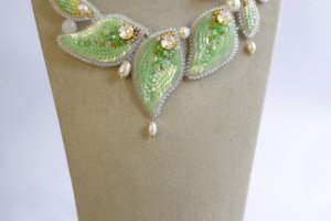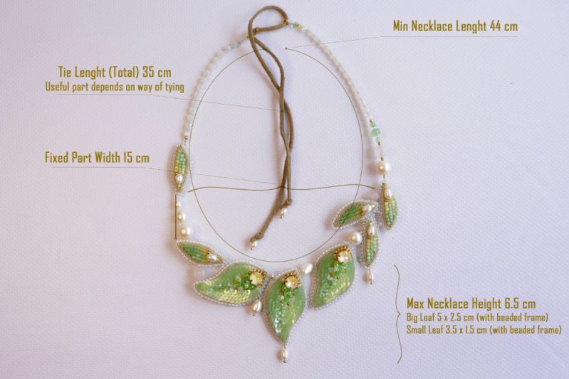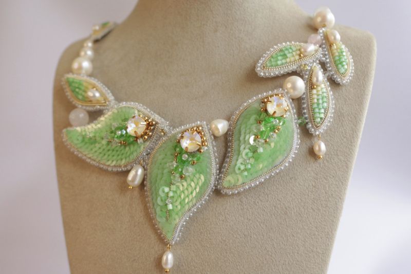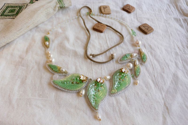 Нежное ажурное светло-зеленый колье с натуральными жемчужинами (культивируемые). Авторский дизайн, вдохновленный темой "Властелина колец" и ирландским кружевом. Листочки вышитые пайетками, чешским бисером, хрустальными бусинами и стразами с кришалевого стекла премиум класса. Обратная сторона - натуральная кожа светлого бежевого цвета. Бусины на ювелирном тросике, длина ожерелья регулируется завязкой с замшевой шнура - можно завязывать удобным для вас способом. Технические моменты: только сухая чистка, оберегайте от падения на твердые поверхности, не подвергайте воздействию агрессивных моющих средств (жемчуг и кожа этого не любят). Золотистая фурнитура (бусины, колечки, пены) темнеть к оттенку 'античного золота ", станет не такой блестящей. Колье выполнено в единственном экземпляре. Точный повтор возможен, но его не будет :-) Будут другие варианты темы. Поэтому, приобретя это украшение, вы получите не только кусочек эльфийского мира, но и уникальную авторскую вещь. Будут вопросы - пишите. С удовольствием отвечу.