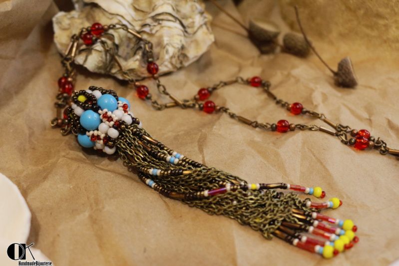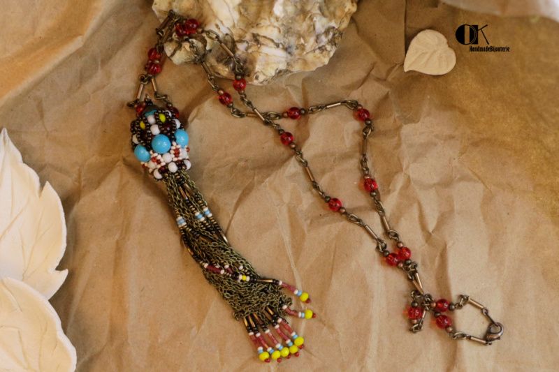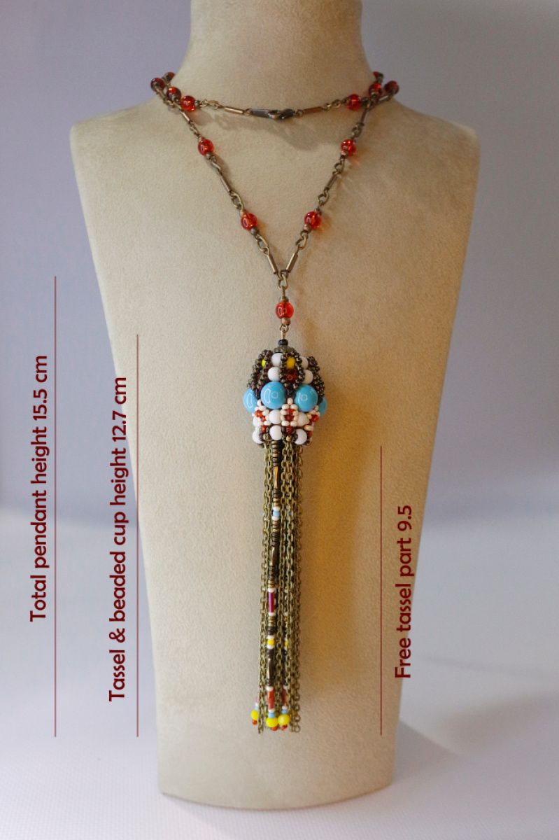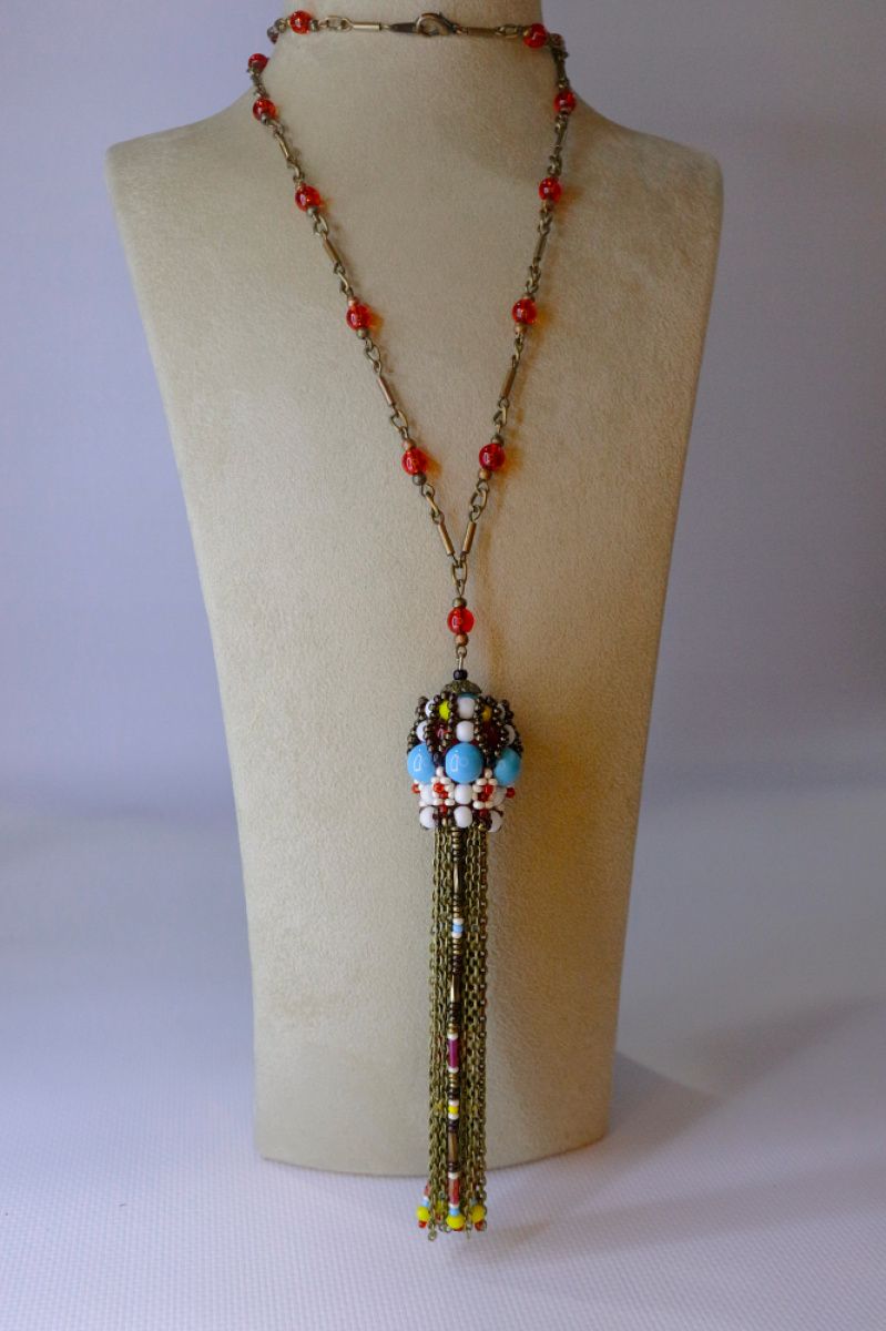 Несъемный кулон на удлиненном цепочке из бусин (красных стеклянных и медных). Цепочка собран из анодированных алюминиевых звеньев и элементов на латунной основе. Кисть - сочетание дрибноланкового цепочки цвета античной бронзы и бисерных низок. Декоративная 'шапочка "выполнена из стеклянных бусин и чешского бисера. Основные цвета украшения: бронзовый, красный, голубой, белый, желтый. Яркие чистые цвета в лучших традициях древних культур. Этот кулон содержит частичку первоначальной дикой эстетики, поэтому хорошо дополнит неформальных образ, одежда из натуральных материалов. По запросу могу немного изменить базовую длину цепочки. Кроме того, в кулона предполагается пара простых сережек-подвесок, варианты обсудим при заказе (длина, основной цвет и т.д.)