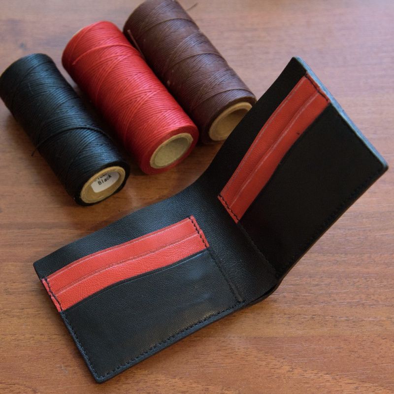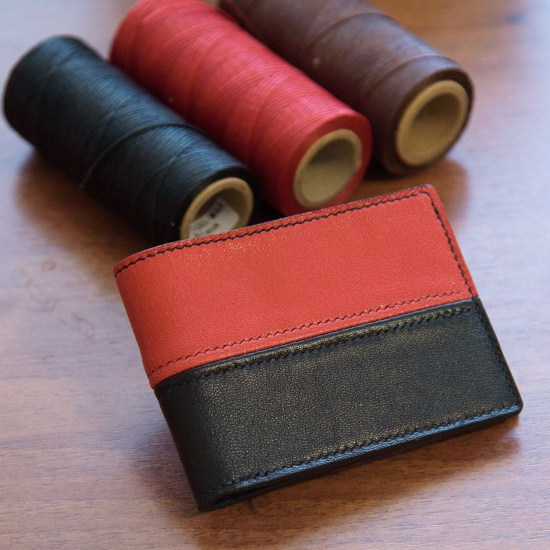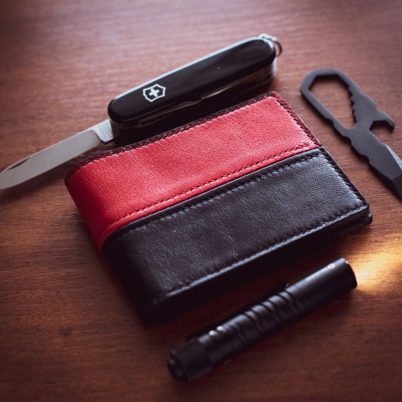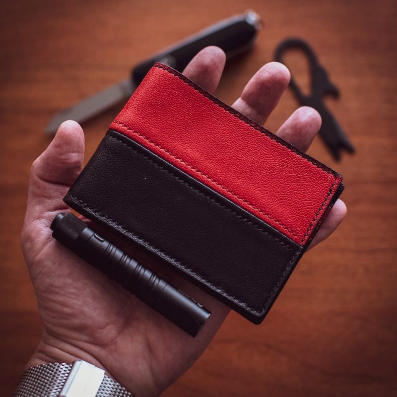 Кожаный кошелек ручной работы. Изготовлен из натуральной итальянской кожи козы красного и черного цветов, прошитые вручную. Имеет 1 отделение для купюр и 6 отделений для пластиковых карт.