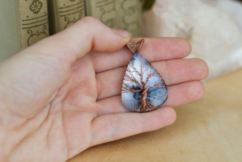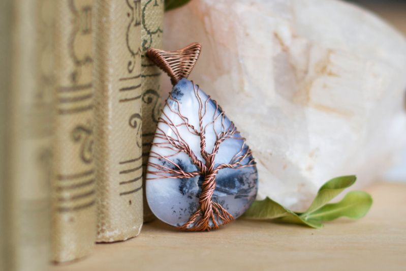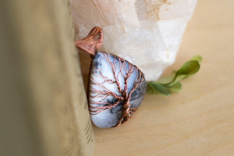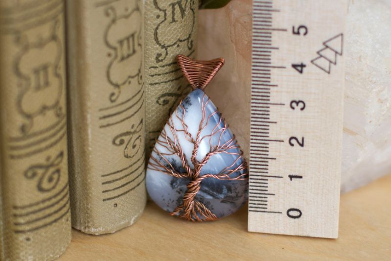 Кулон выполнен из меди и крупного дендритного опала. Главная особенность камня - чёрные включения на белом фоне. Нередко они напоминают ветви деревьев, мох или папоротник, что и послужило причиной изображения на камне символа "дерево жизни"