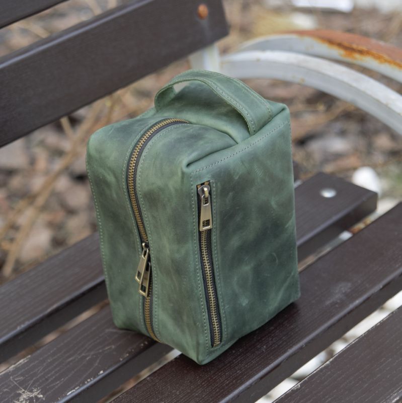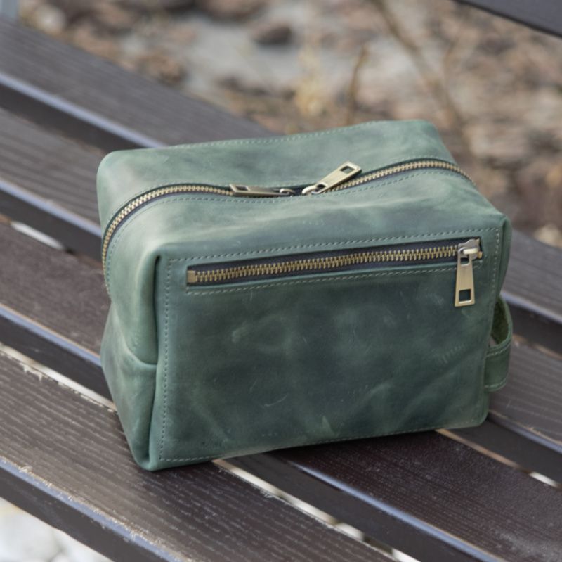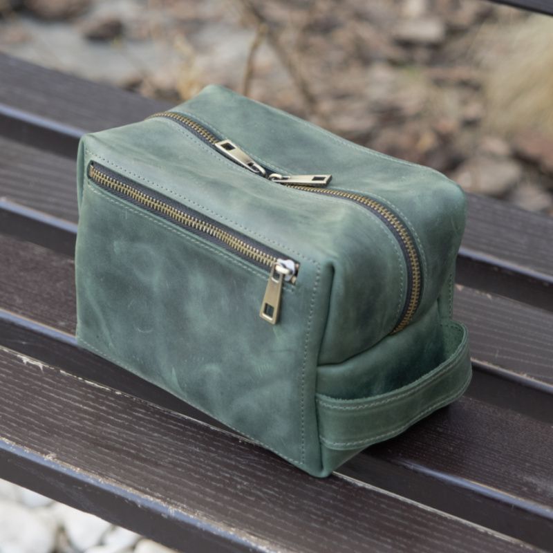 Нессер зелёного цвета из кожи крейзи хорс. Имеет два кармана и одно основное отделение на молнии. Кожа "крейзи хорс" - вид высококачественной кожи КРС повышенной прочности, получаемый с помощью оригинальной финишной обработки, а именно нанесения специальных восков на поверхность шлифованного краста. Цвет покрывной смеси темнее, чем фоновый цвет краста. В результате кожа приобретает свойство менять цвет в местах изгиба, залома или натяжения - высветляется. Отличительная внешняя особенность этой кожи – винтажность. На коже легко остаются царапины, следы, если ее зацепить чем-то твердым. Но это плюс этой коже, т.к. придают ей шарм «старины». Царапины легко при желании удалить, потерев место чем-то мягким (пальцем, тканью, ластиком).