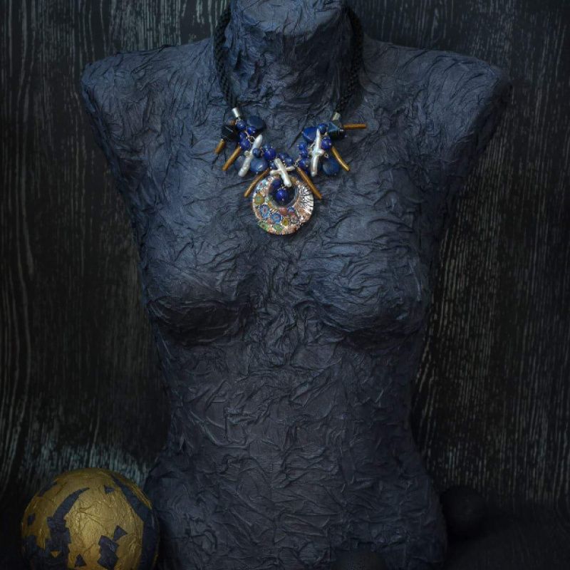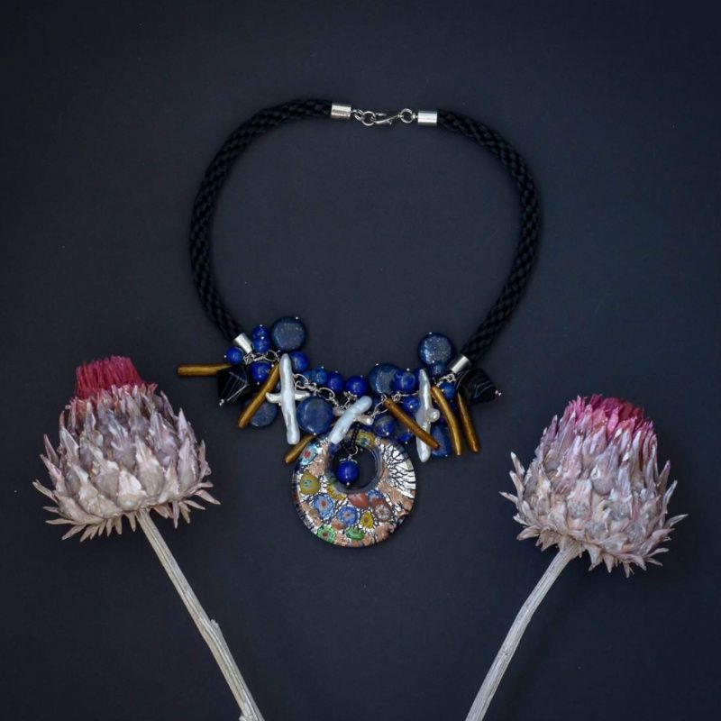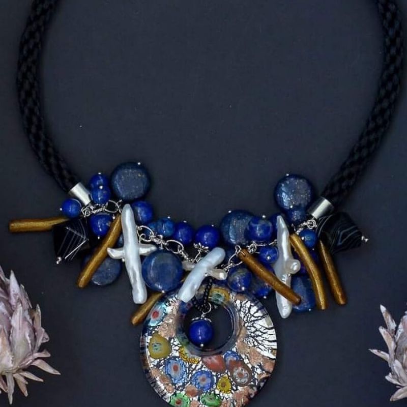 Дизайнерское украшение с венецианским подвесом покорит вас разнообразием форм, оригинальностью и красотой натуральных камней( натуральный баррочный жемчуг,афганский лазурит, золотые коралловые веточки, черный агат)
