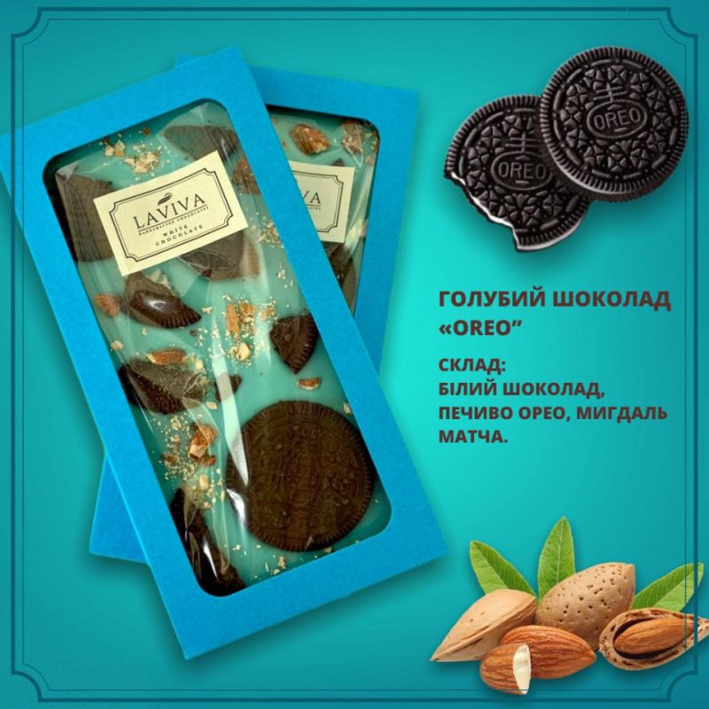 Уникальный органический шоколад для любителей Орео. Авторский рецепт белого шоколада ручной работы с натуральными специями: пудра сублимированного лимона и голубя матча внутри и Орео с миндалем на поверхности плиточки, такое сочетание создает непревзойденное впечатление и подходит по особенному. Идеальный шоколад возможен только с идеального бельгийськоко шоколада Callebaut, что является основой Laviva. ✔ 100% Натуральные ингредиенты ✔ Без ГМО и химии ✔ Без транс-жиров и консервантов ✔ Сделано в Украине ✔ Ручная работа ✔ Уникальная рецептура Вес: 100 ± 5 г Срок годности один год с момента изготовления. Хранить в прохладном и сухом месте при температуре 18-22С. Шоколад является прекрасным подарком на День рождения, ко Дню влюбленных, 8 Марта и в качестве корпоративного подарка.