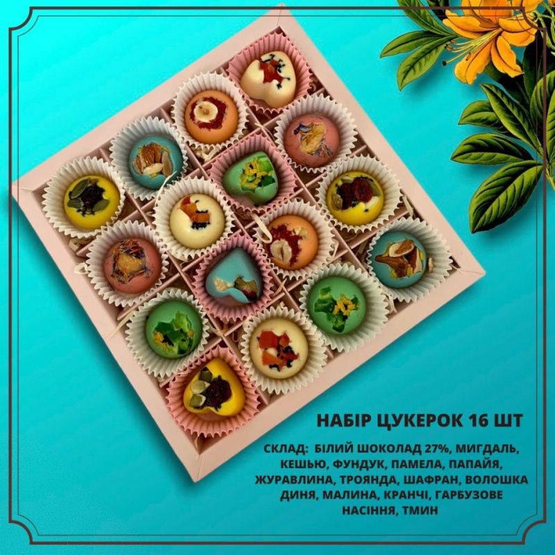 Уникальный рецепт шоколада, который в своем составе содержит только натуральные красители- матча, порошок фруктов, чайная роза. Невероятно красивый набор, который подойдет для подарка и не только. Разноцветные конфеты подарят невероятные эмоции. В наборе 9 конфет.✔ 100% натуральных ингредиентов ✔ Без ГМО и химии ✔ Без транс-жирив и консервантов ✔ Сделано в Украине ✔ Ручная работа ✔ Уникальная рецептура .Срок годности один год с момента изготовления. Хранить в прохладном и сухом месте при температуре 18-22С.