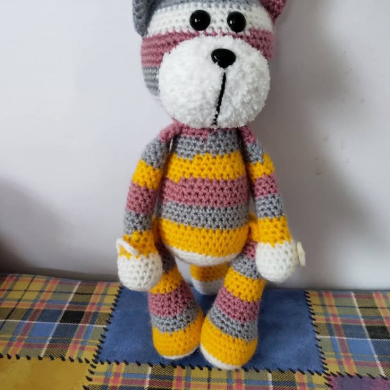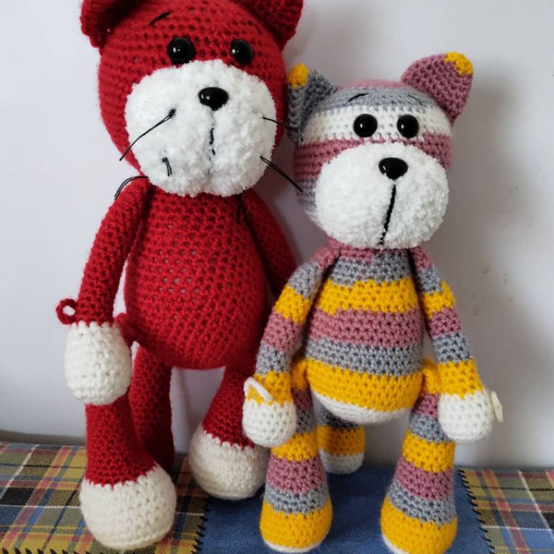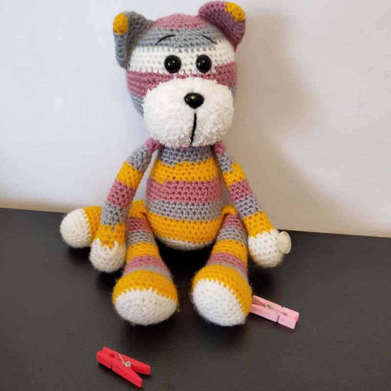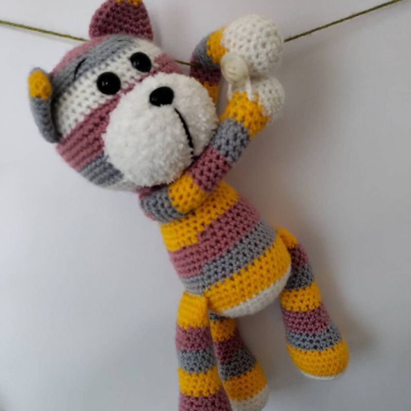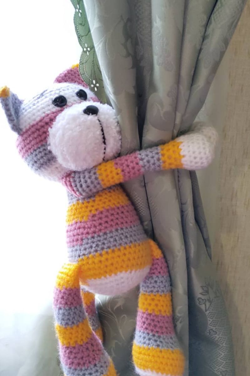Котик вязанный из акриловой пряжи. Наполнитель холлофайбер, глазки на безопасном креплении. Игрушка и подхват для штор. На одной лапке застежка пуговица, на другой лапке-петелька.Цвет -полосатый, возможно изготовление в других цветах.