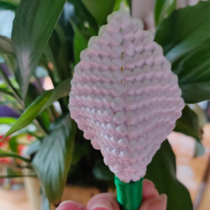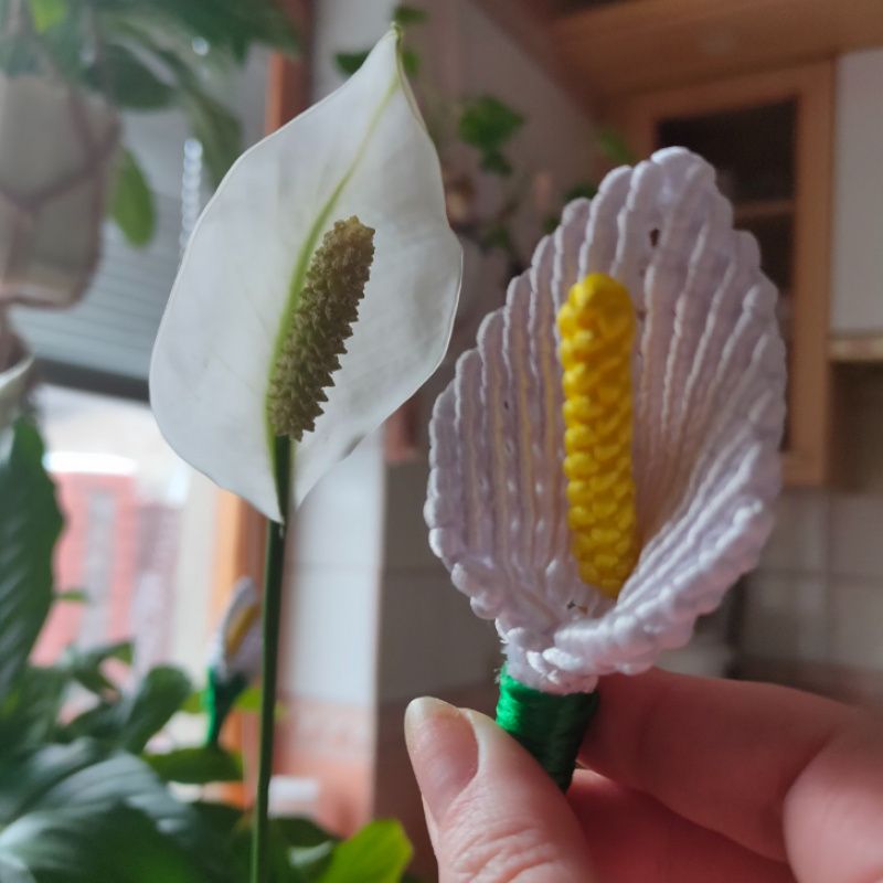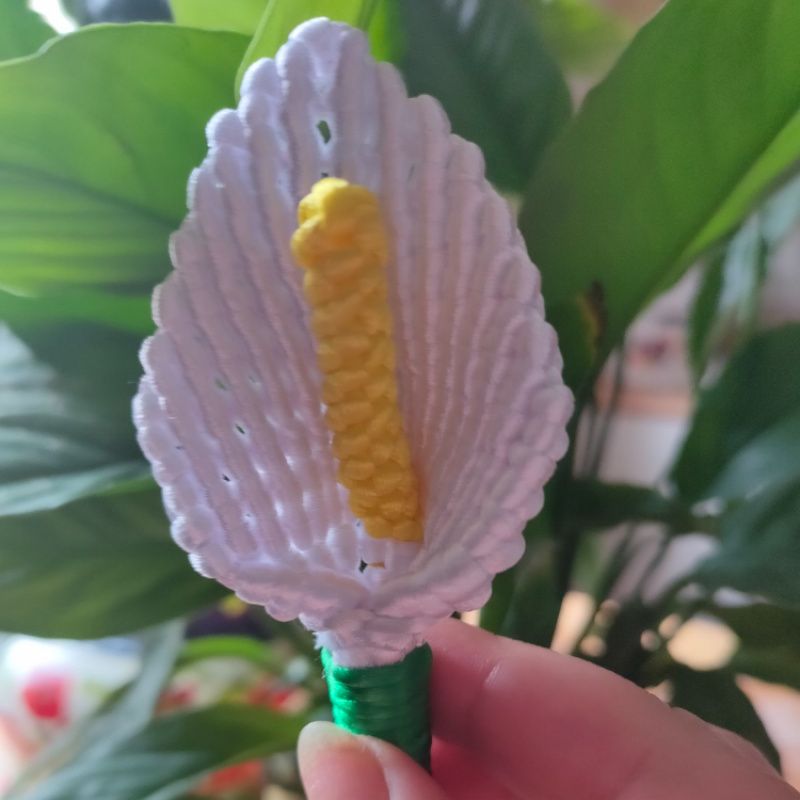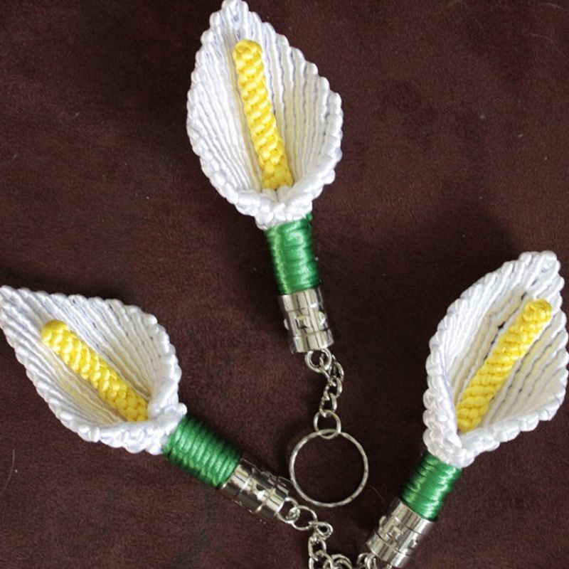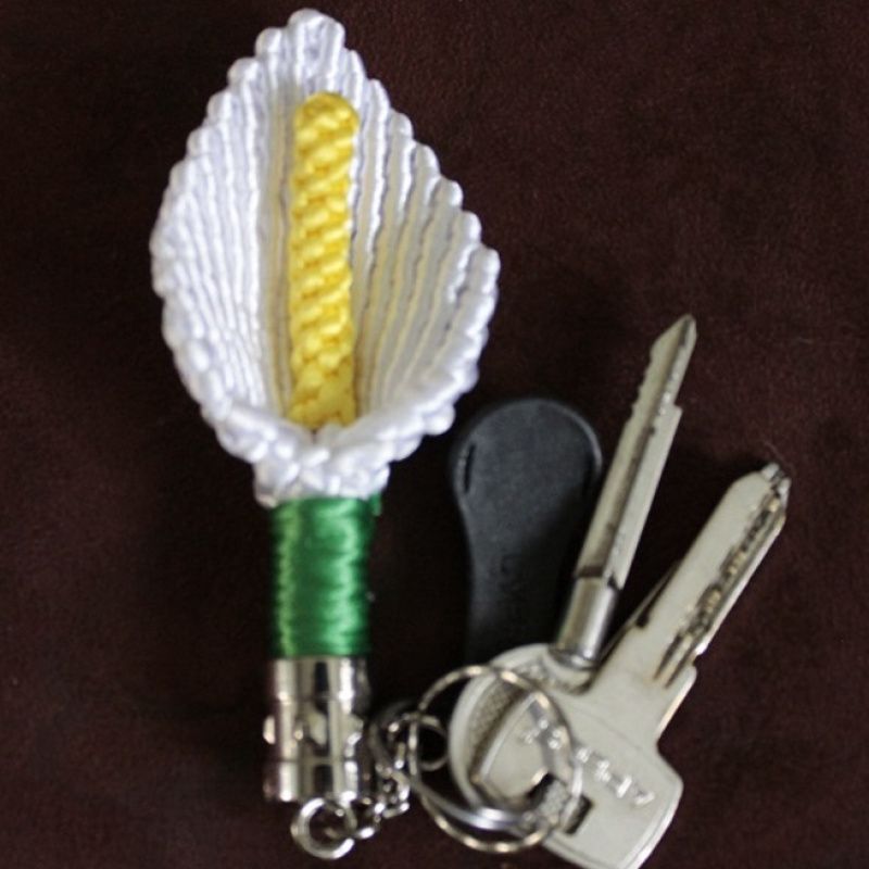Брелок "цветок спатифилумаьсплетений в технике макраме из атласного шнура.Висота (без цепочки и кольца) 9-10 см.Може использоваться как брелок или украшение для сумок, рюкзаков и т.д. ...