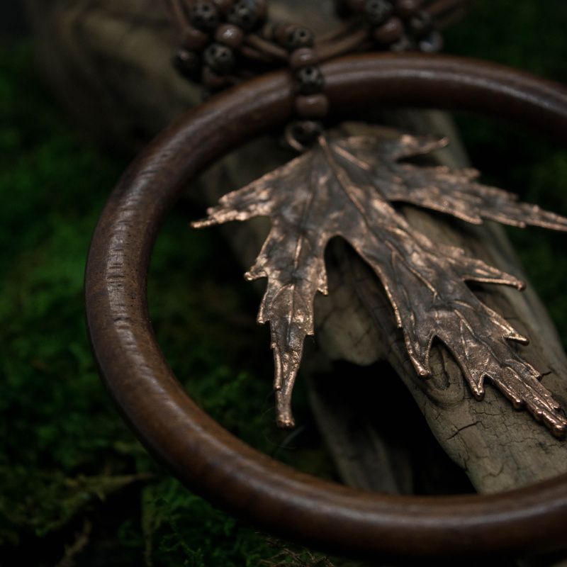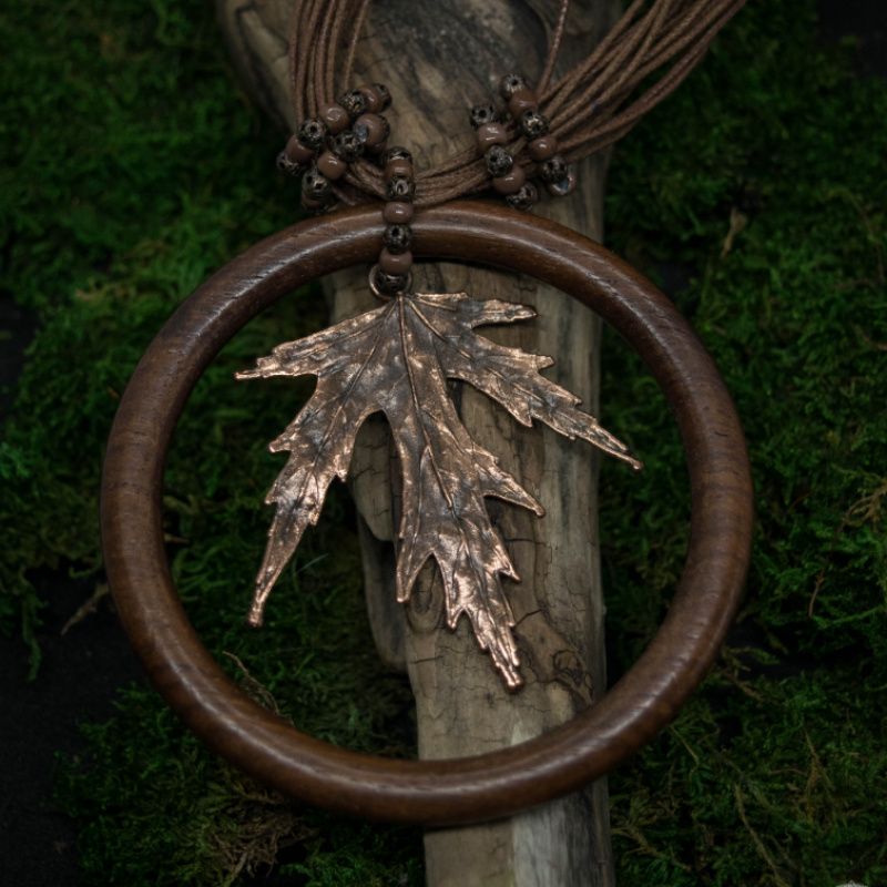 Настоящий кленовый листочек покрыт медью Выполненный в технике гальванопластика. Диаметр деревянного круга - 8 х 8 см