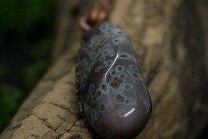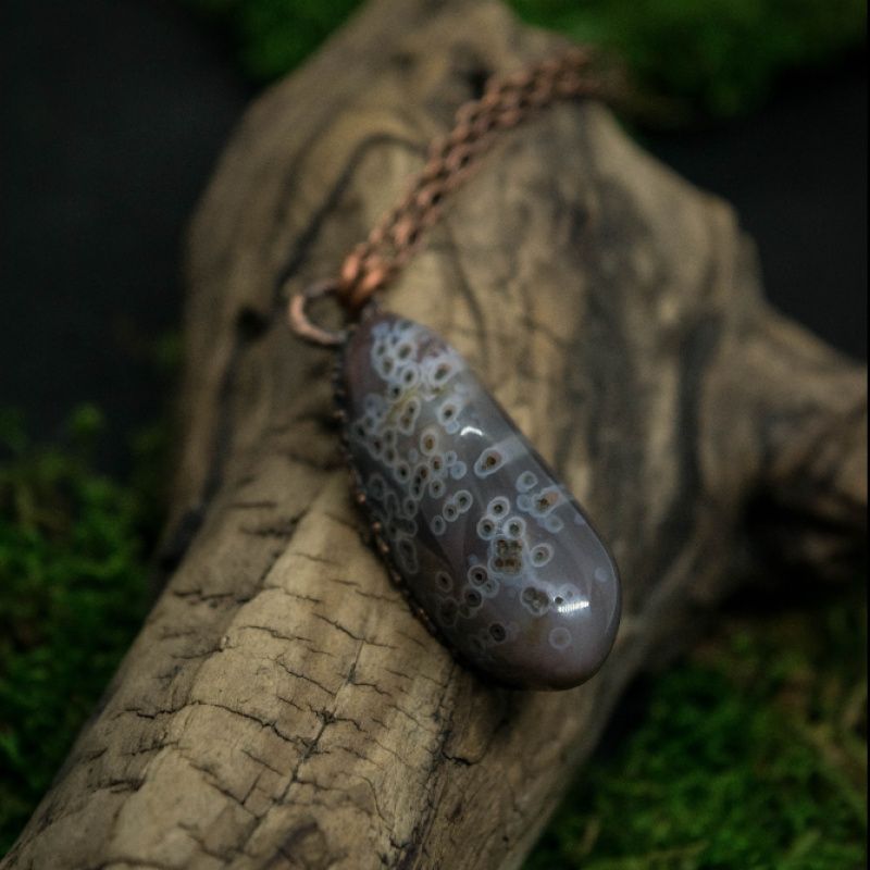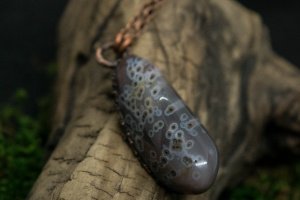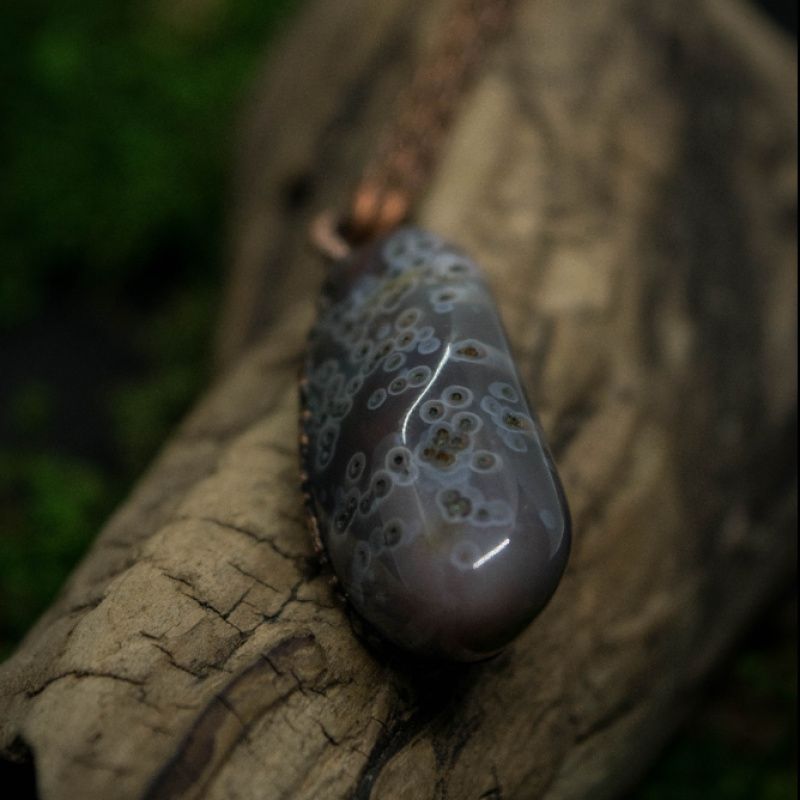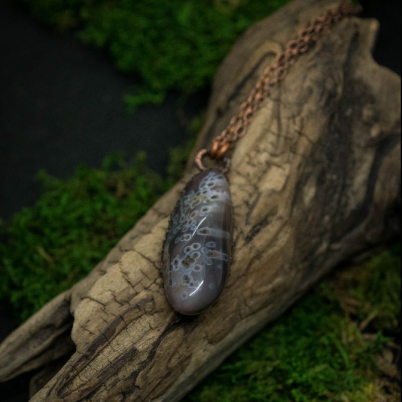 Натуральний дендритовий агат покритий міддю. Виконаний в техніці гальванопластика. Розмір - 4,5 х 1,5 см