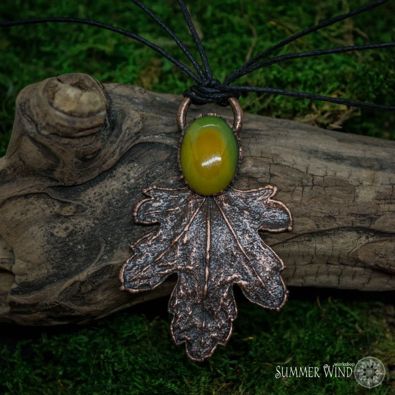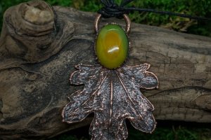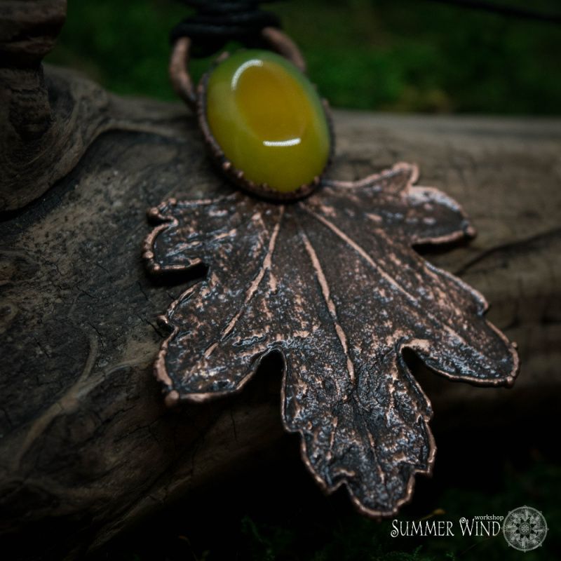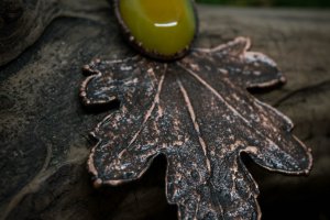 Настоящий листочек хризантемы покрыт медью. Выполнено в технике гальванопластика. Камень - агат. Размер кулона - 6 х 4,2 см