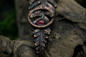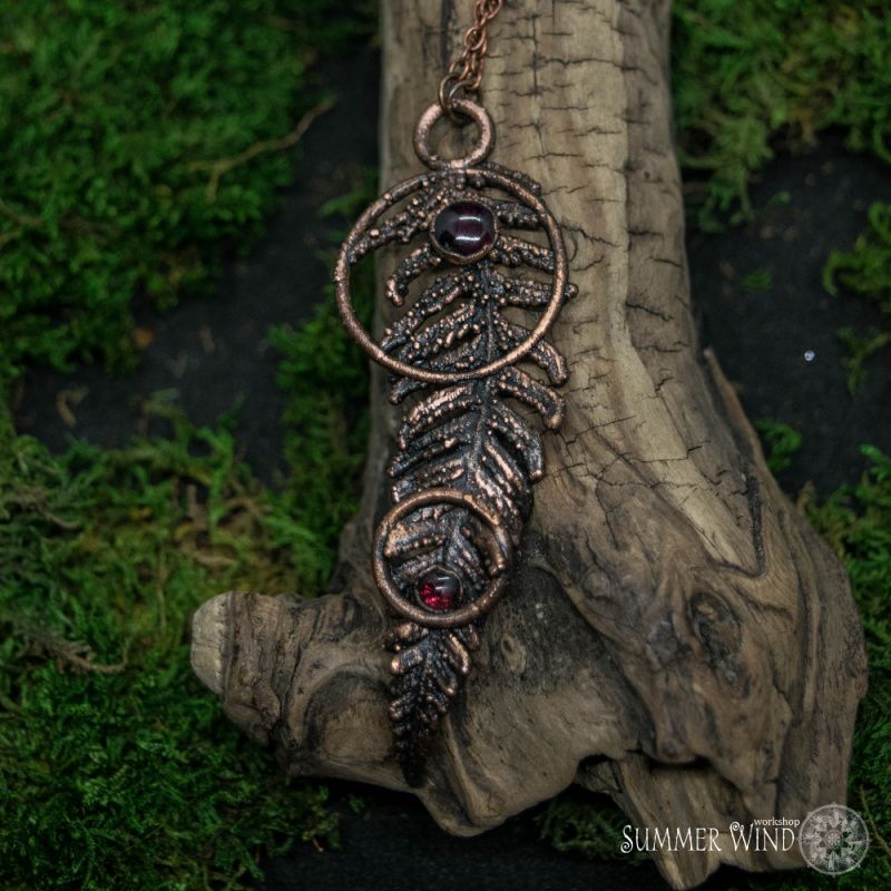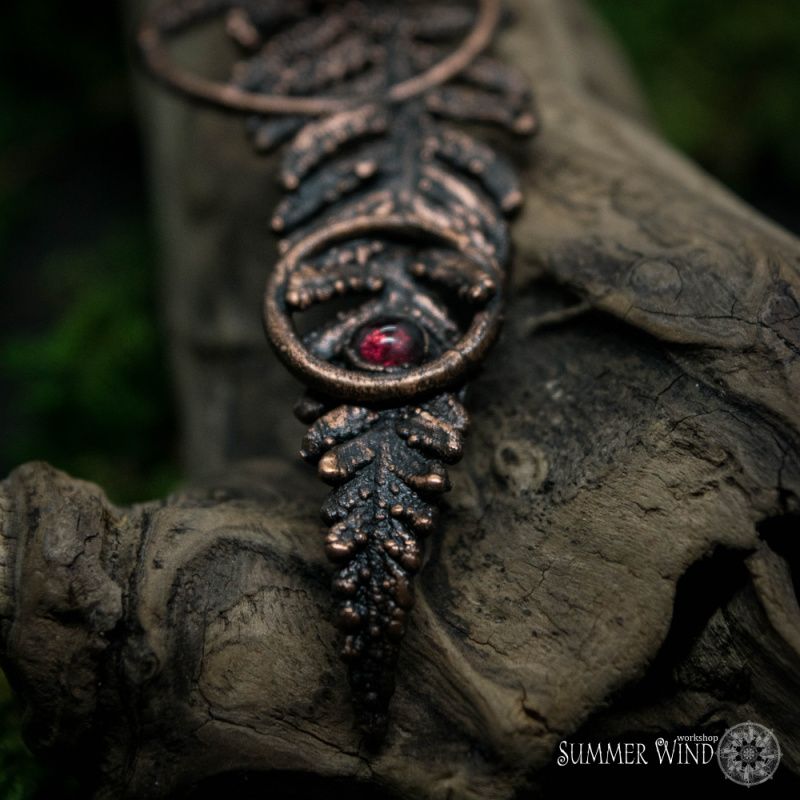 Настоящий папоротник покрыт медью. Выполнено в технике гальванопластики. Камень – гранат. Размер – 7,5 х 2,5 см