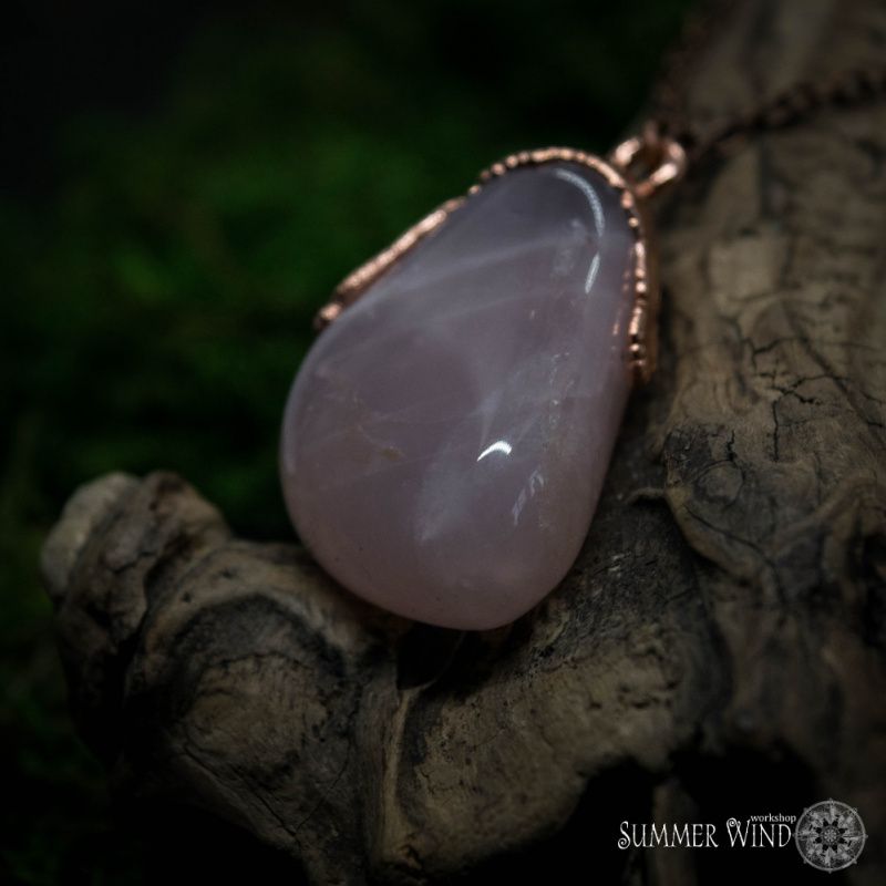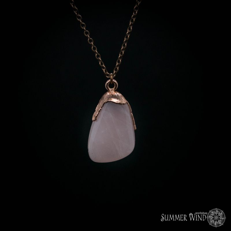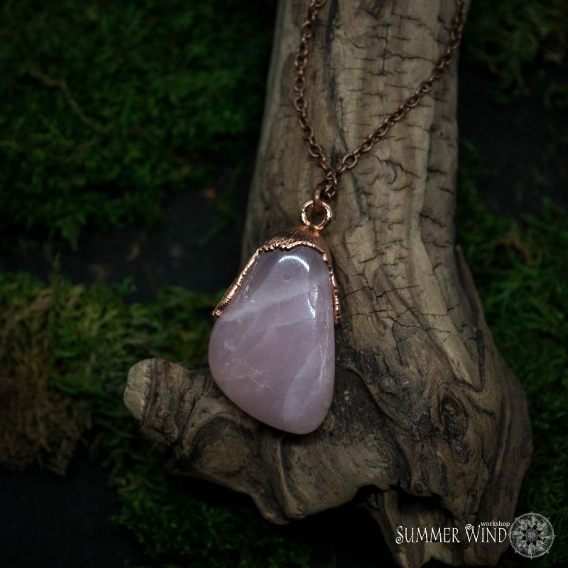Розовый кварц покрыт медью. Выполнен в технике гальванопластики. Размер – 3,5 х 2,3 см