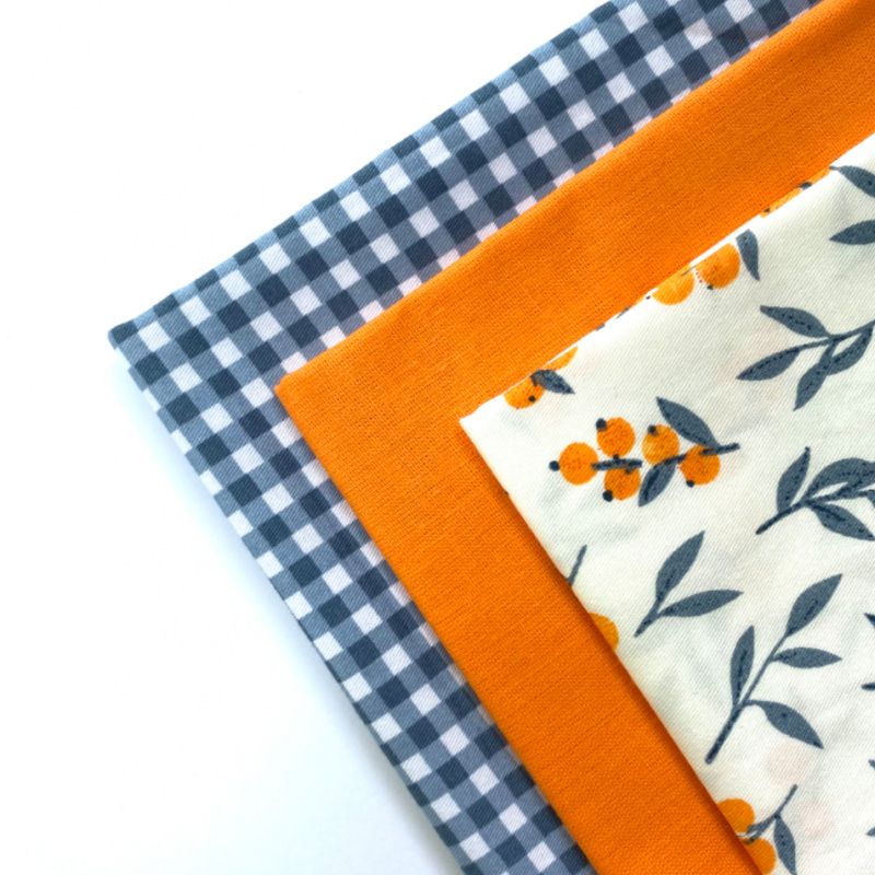 Набор тканей для рукоделия: 1) клетка морская волна (Сатин) отрез 50х40 2) оранжевый однотон (бязь) отрез 50х40 3) веточки облепихи (Сатин) отрез 50х40 К каждому заказу подарок