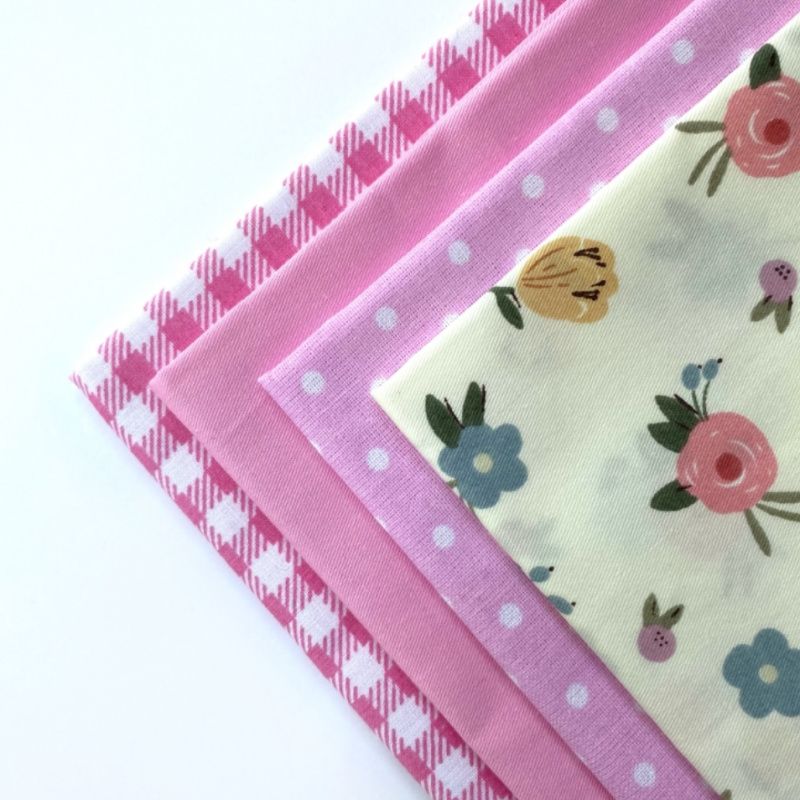 Набор отрезов 50х40 1) клетка розовая (бязь) 2) розовый однотонный (сатин) 3) горошек на розовом (бязь) 4) цветы (сатин) К каждому заказу подарок