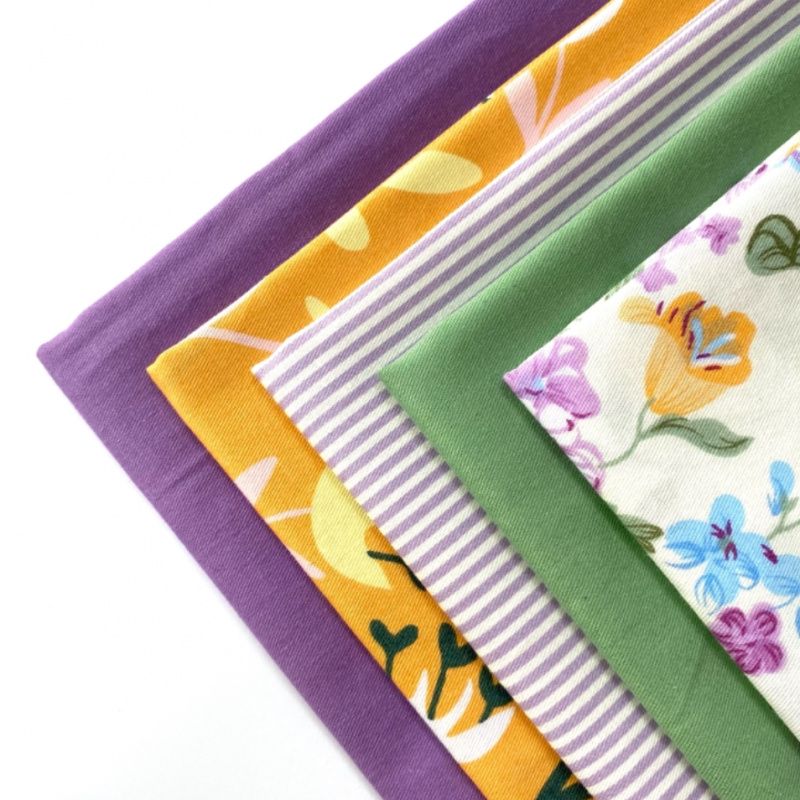 Набор тканей для рукоделия Пять отрезов, размер 50х40 1. Фиолетовый однотонный (сатин) 2. Цветы (сатин) 3. Фиолетовая полоска (сатин) 4. Травяной однотонный (сатин) 5. Цветы (сатин)