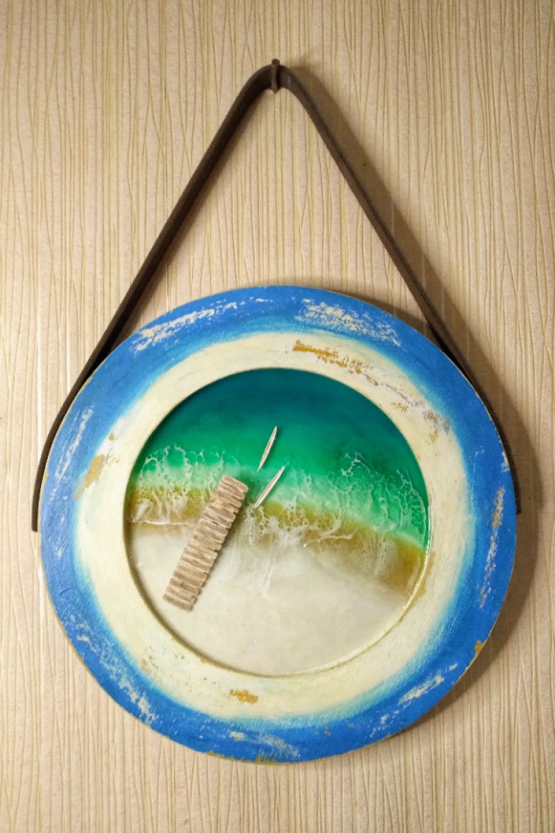 Крепление - кожаный ремень. Выполнена в технике Resin art. Лодочки и мостик выполнены вручную.