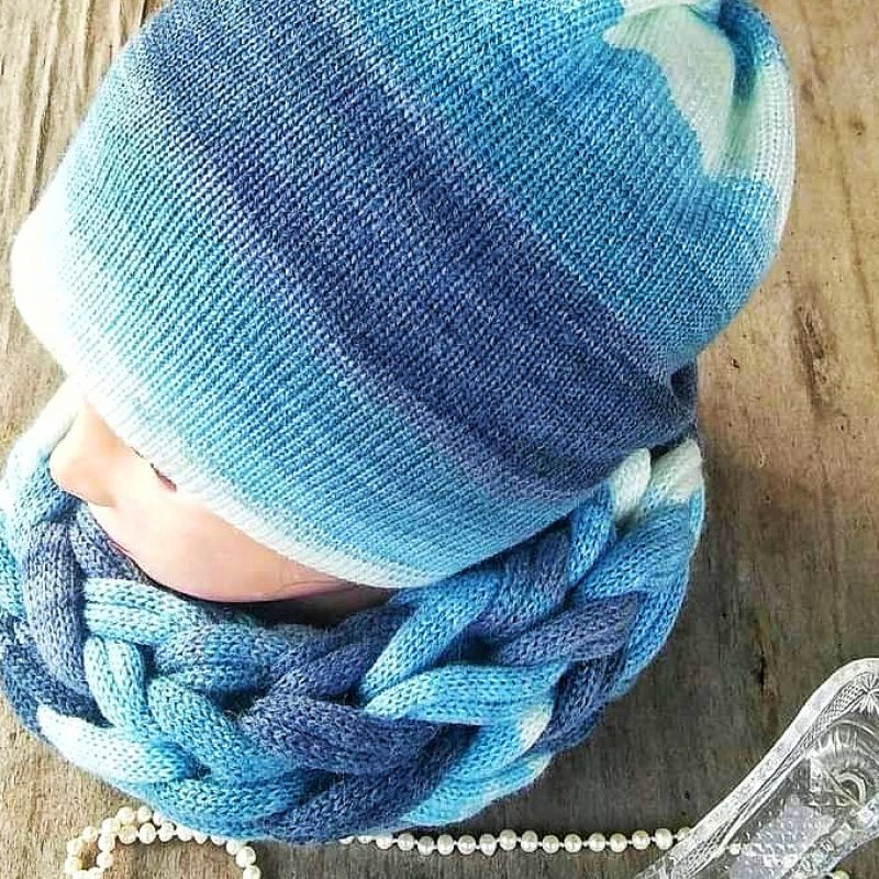 Шапка и снуд из шерстяной пряжи. Шапочка двойная, на макушке отверстие, через которое можно пропустить прическу.