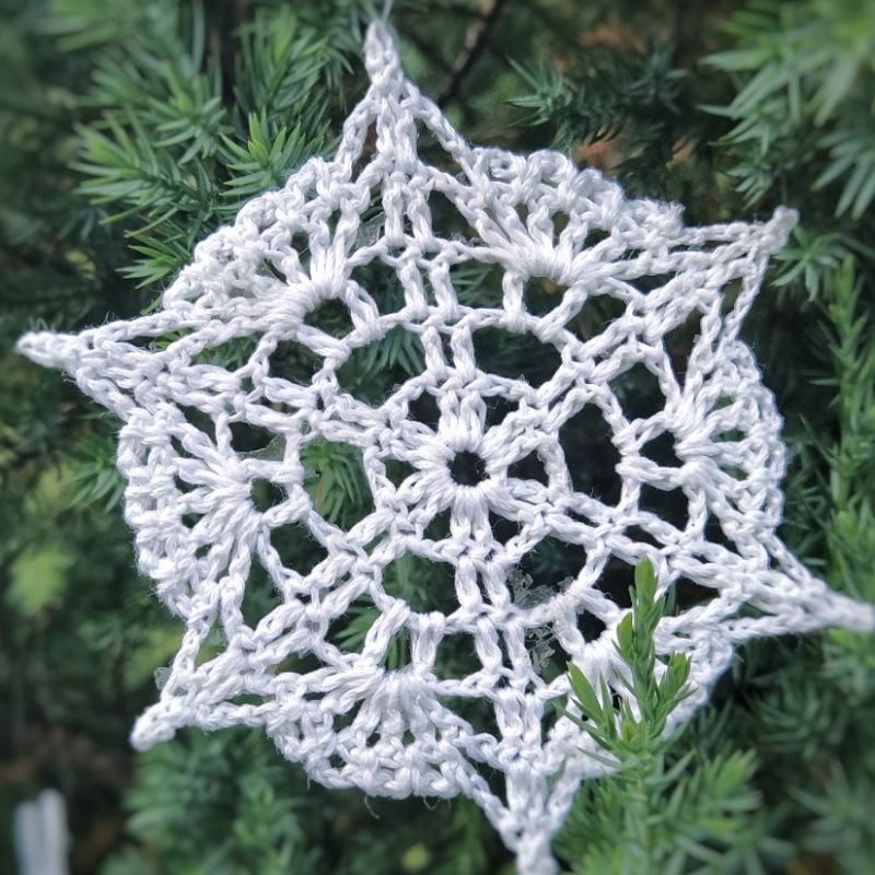Вязаная ажурная снежинка будет прекрасным украшением на елку или для декора интерьера. Хорошо накрахмаленная, держит форму. По заказу свяжу любое количество. Можно укомплектовать набор вязаных украшений: снежинки, колокольчики, ангелочки, шары.