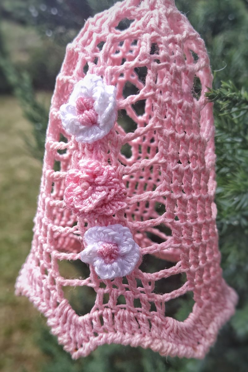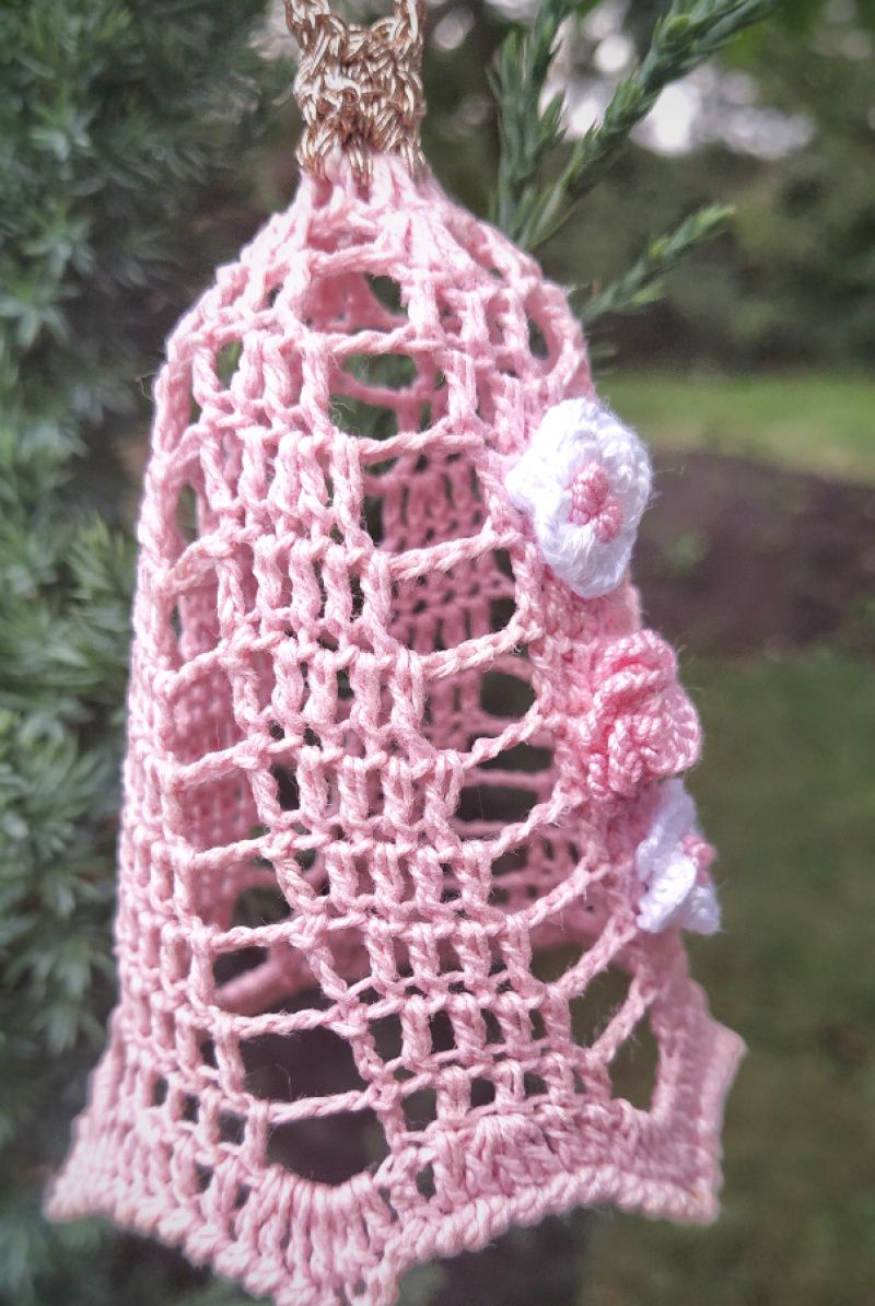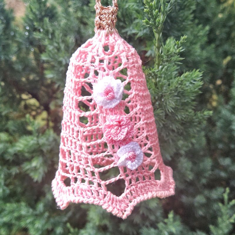 Вязаный ажурный колокольчик будет прекрасной альтернативой традиционным елочным украшениям. Высота 10 см. Хорошо накрахмаленный, прекрасно сохраняет форму. Украшенный вишивкою.На заказ свяжу в нужном цвете и размере.