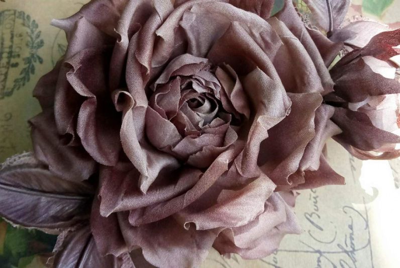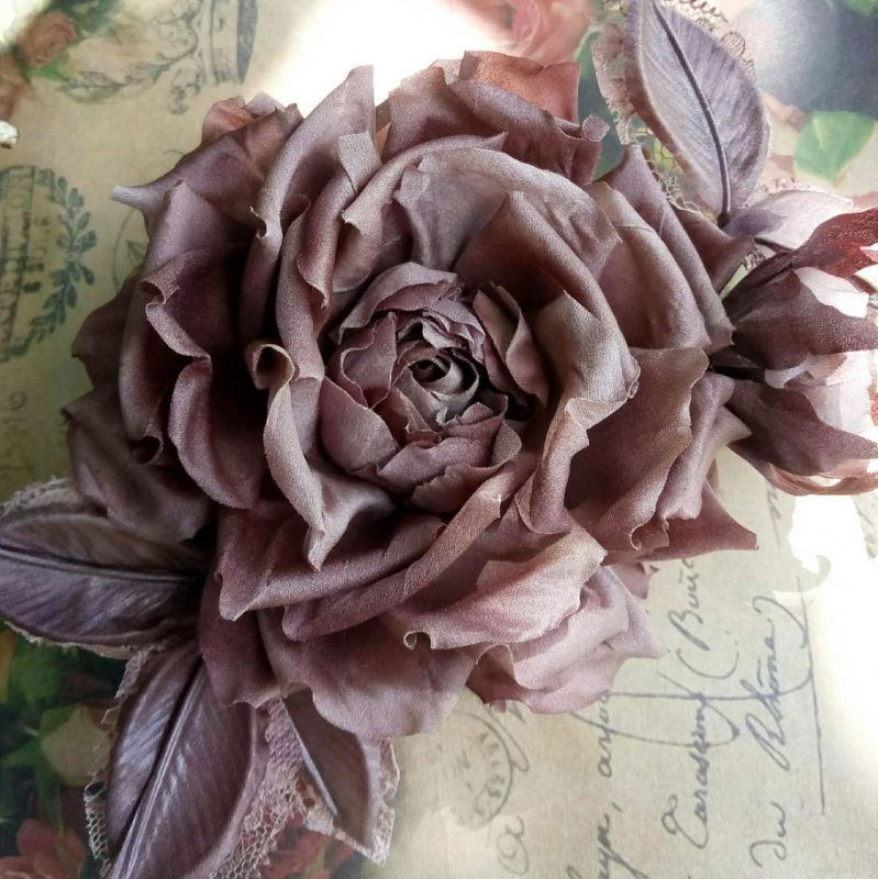 Роза из натурального итальянского шелка и кружева. Каждый лепесток и листик окрашен вручную. Диаметр ок. 11см . Крепление по желанию.