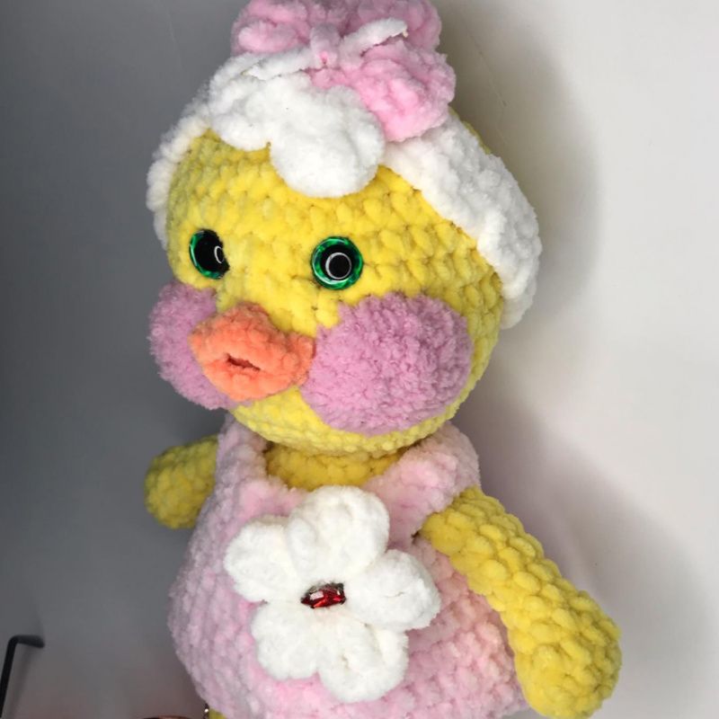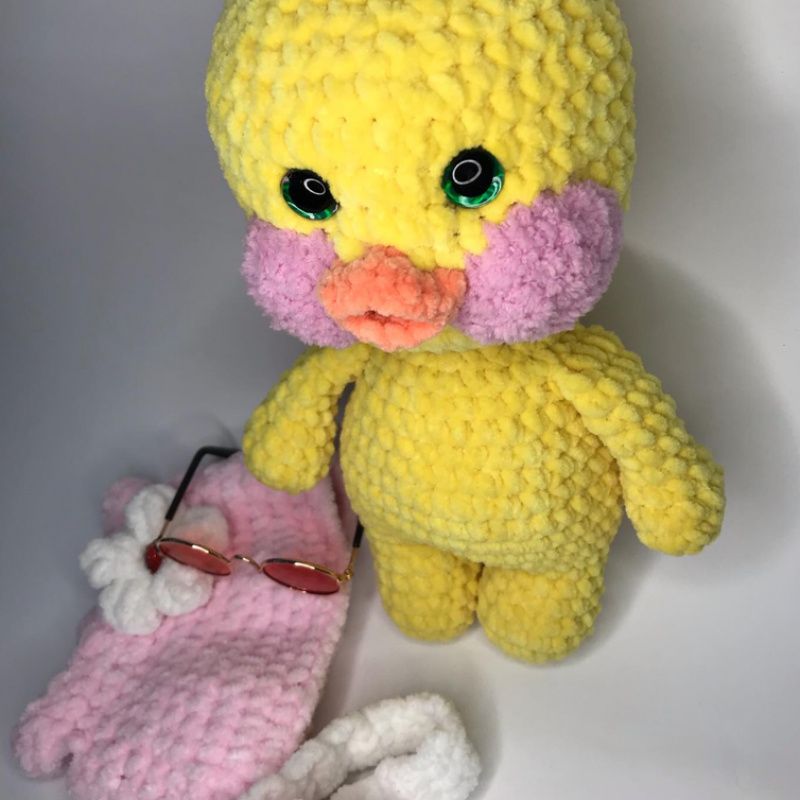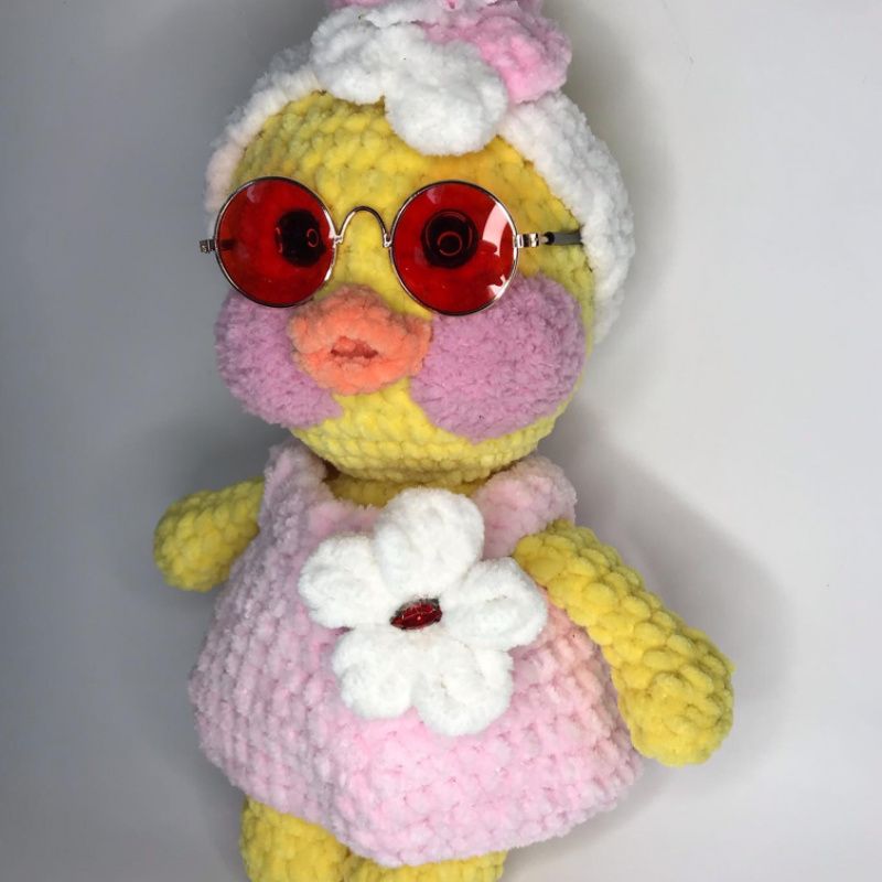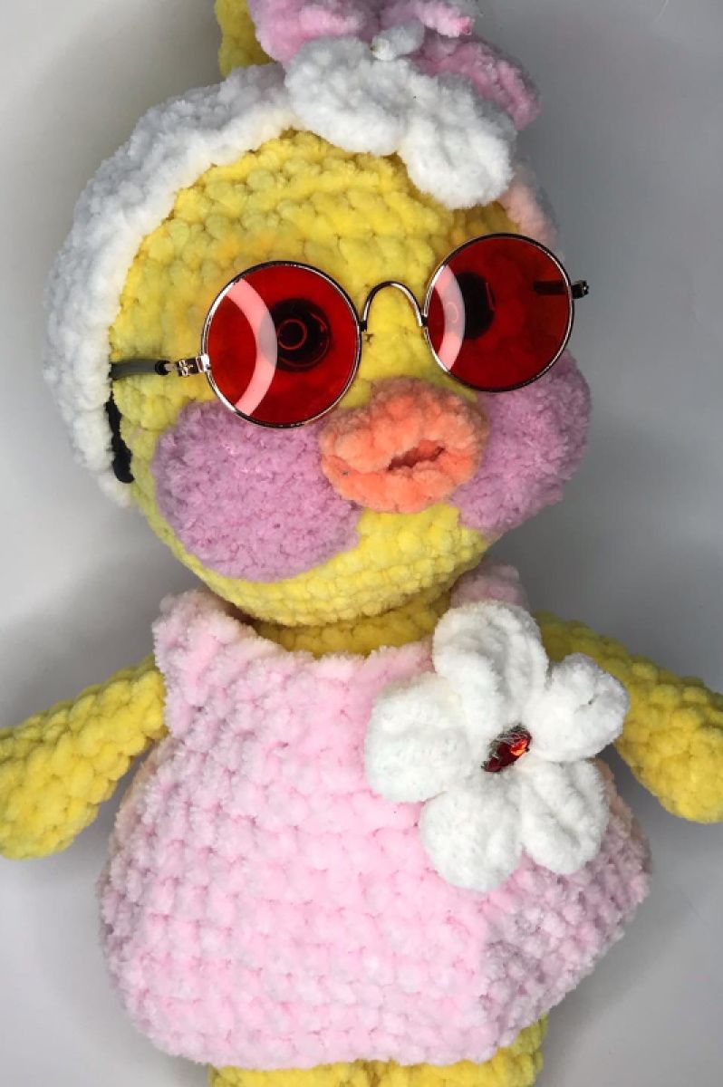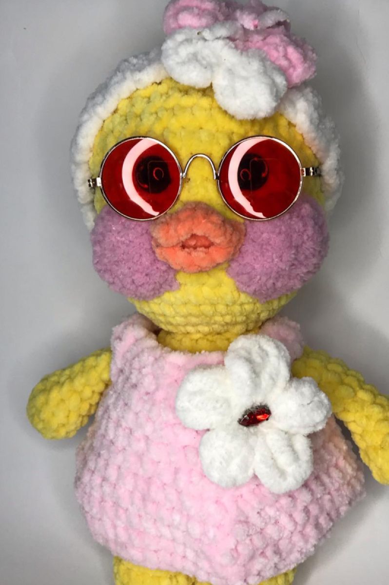Качечка Лалафанфан,Плюшева іграшка ручної роботи. Ростом 35см.Очі пластикові. Одяг зйомний. Наповнювач синтепух. Окуляри скляні