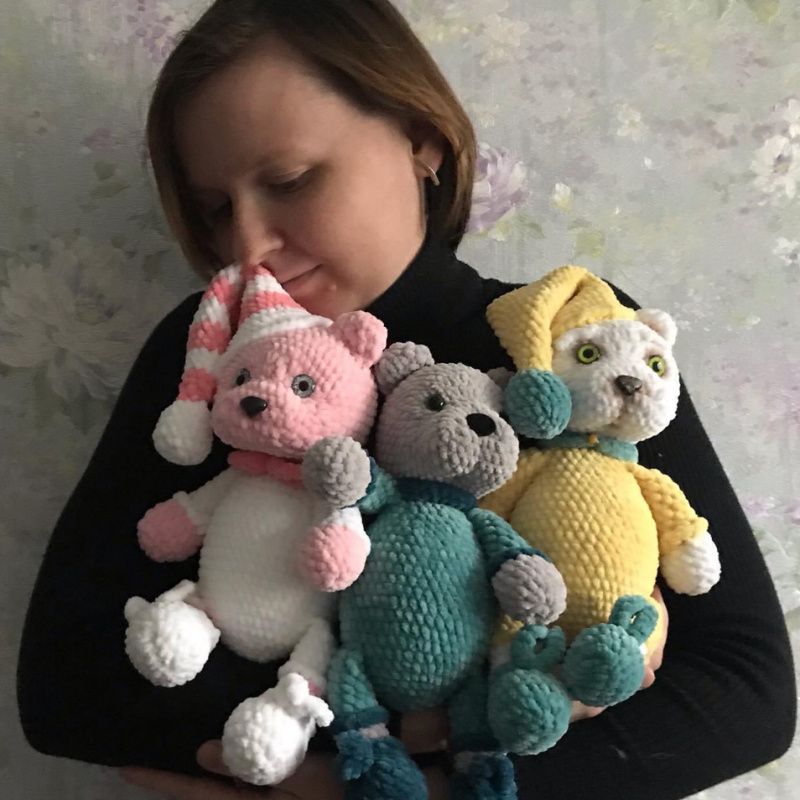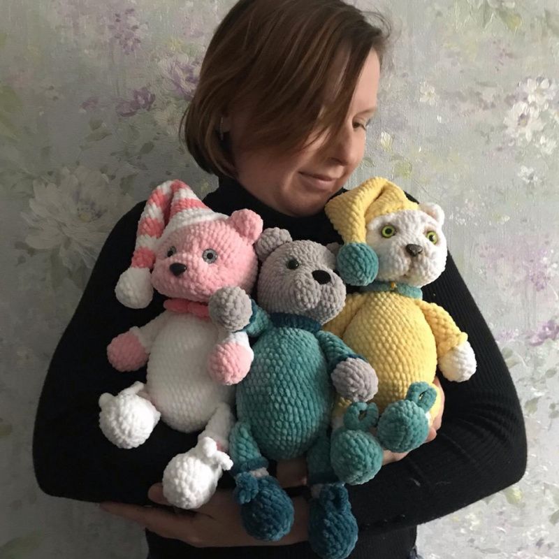 Мишка плюшевый. На фото разные дети, могу связать в любом цвете. Наполнитель синтепух. Глаза стеклянные (можно пластиковые) носик пластиковый.