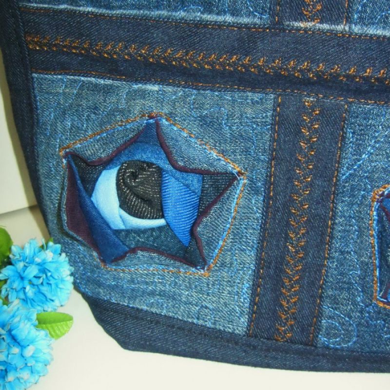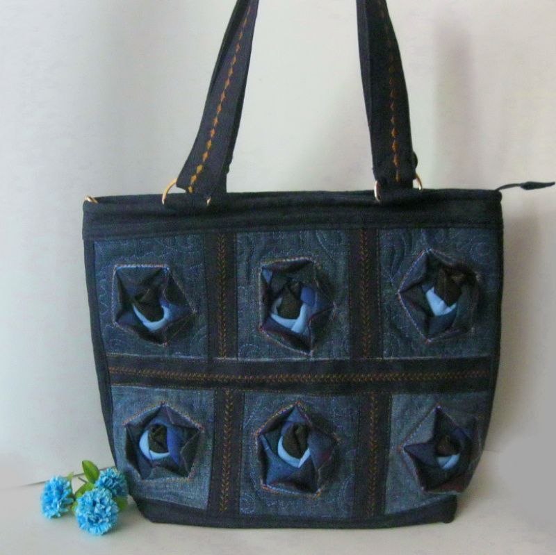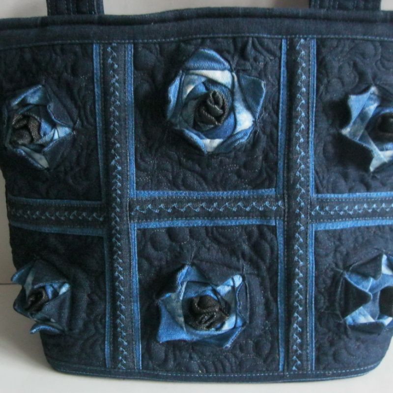 Сумка "Джинсовые розы" создана в лоскуточной технике пэчворк. Оригинальность сумочке предоставляют розы, собранные из разных оттенков джинсовой ткани от темной к светлой. Обратная сторона сумочки прошит в технике Сашико. Сумочка вместительная и практичная. Внутри четыре больших кармана, в т.ч. одна большая на молнии.