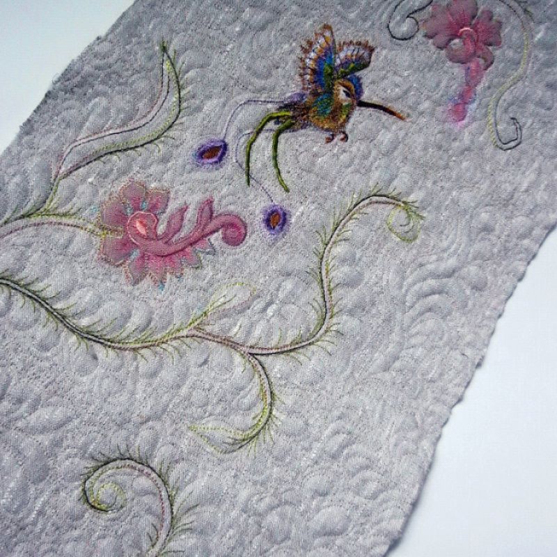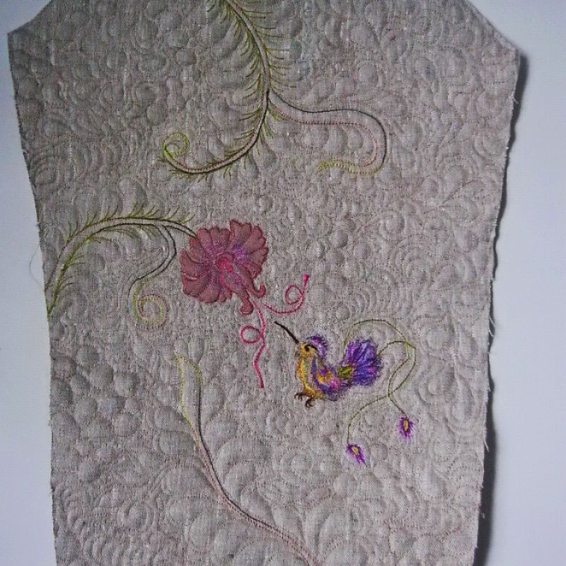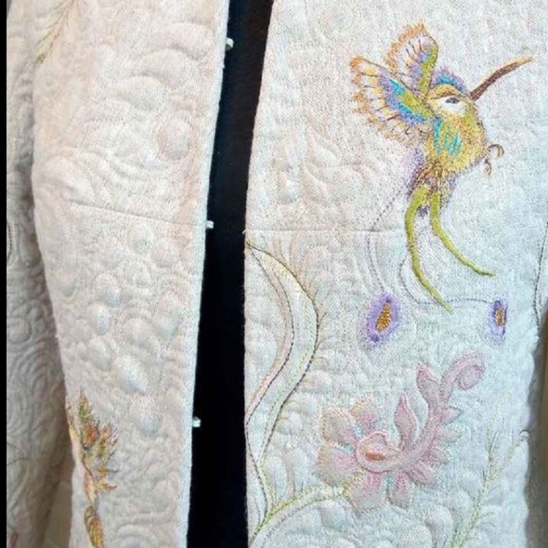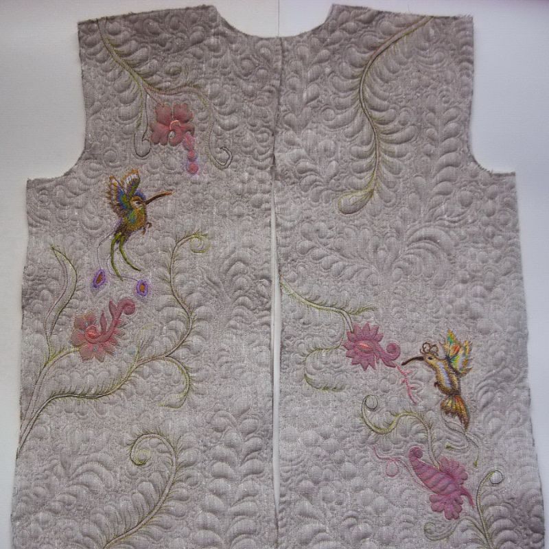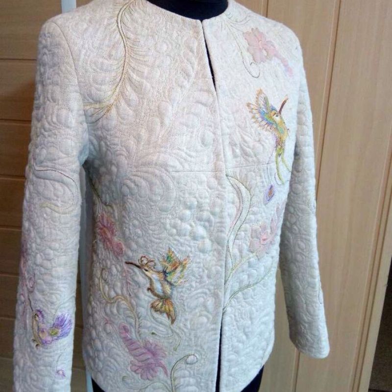 Выполню под заказ машинную вышивку и художественную стежку (квилтинг) деталей жакета. Жакет вышитый фантазийными цветами и птицами колибри с асимметричным их расположением. Особенность изделия - машинная стежка, которая создает особую, неповторимую о "емкую фактуру. Пошив жакета на расстоянии не выполняю. Для достижения точной подгонки по фигуре необходим пошив с примирками на месте.