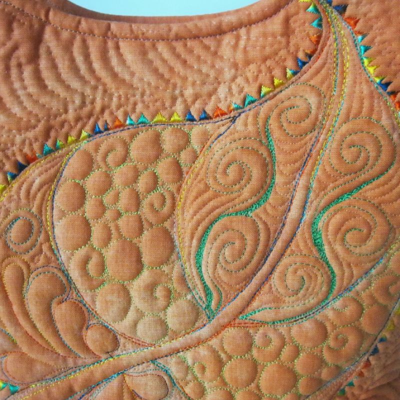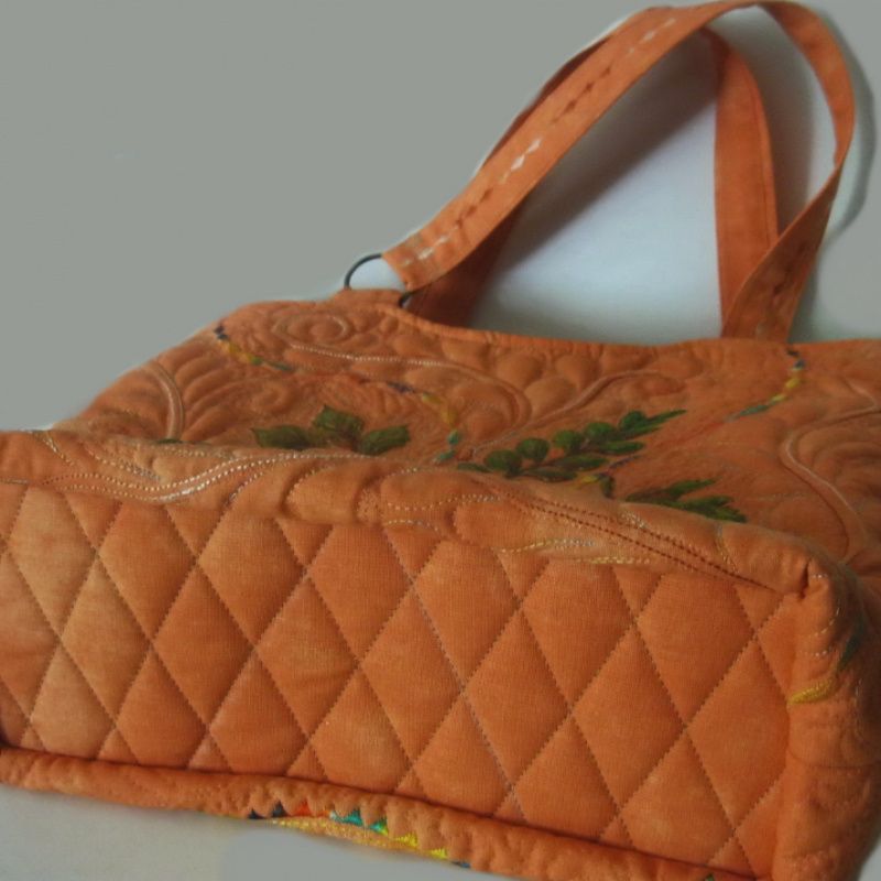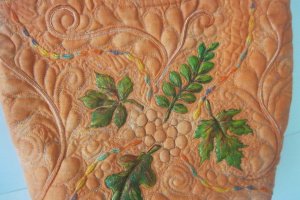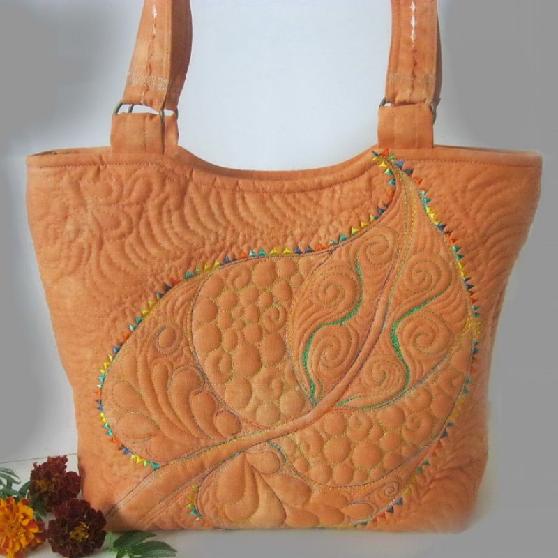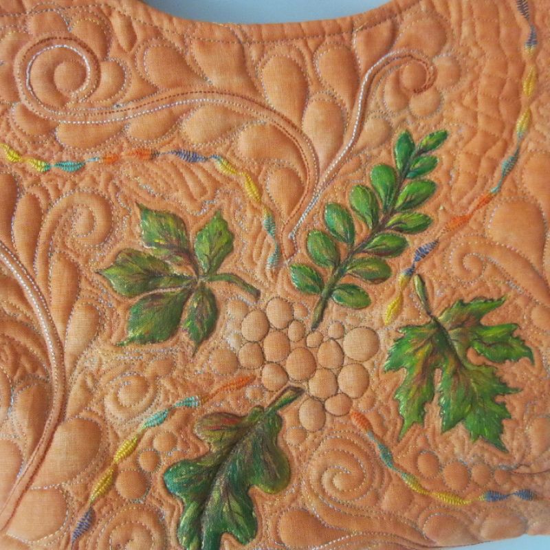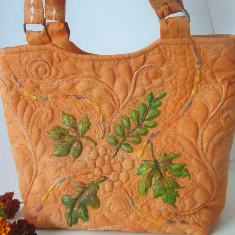 Яркая текстильная сумка, выполненная в технике квилтинг. Рисунок листьев выполнено стойкой краской для текстиля декольте. Главным украшением сумочки есть своеобразная фактура, достигнута с помощью машинной стежки. Сумочка хорошо держит форму. Стойка. Вместительная. Имеет жесткое донышко. Четыре внутренних кармана, в т.ч. одна большая на молнии.
