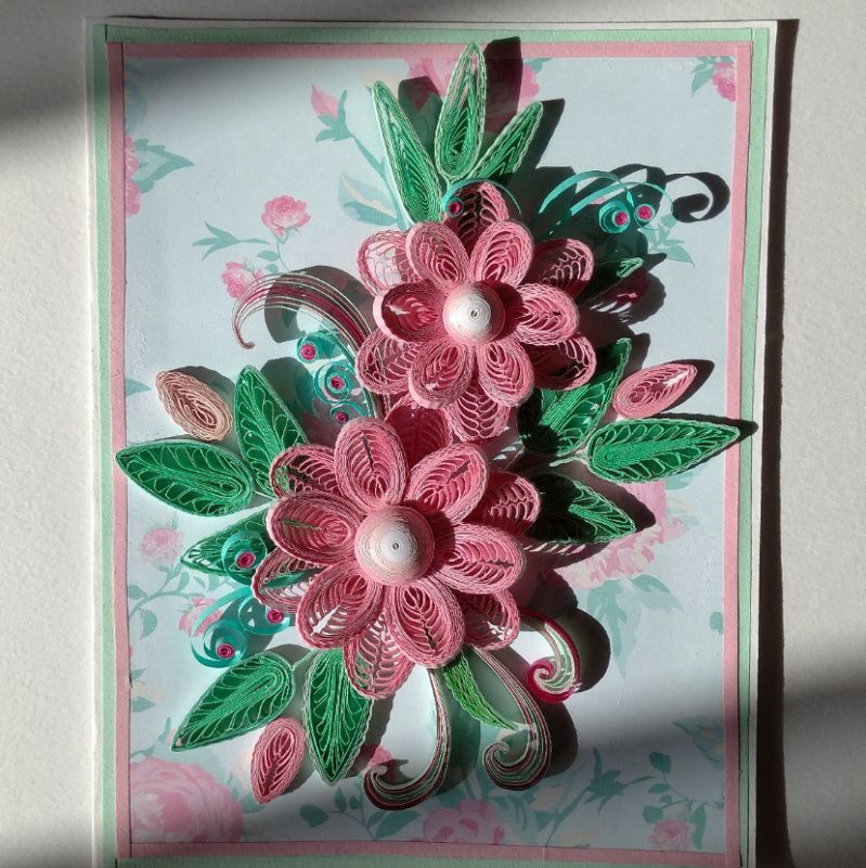 Открытка сделана из бумажных полос шириной 3 мм. Подойдет для различных случаев - день рождения, годовщина свадьбы или просто благодарность. Открытка двойная, внутри вы можете написать свои пожелания. Если у вас желание подарить деньги, то сообщите мне, я вклеил уголок для размещения денег