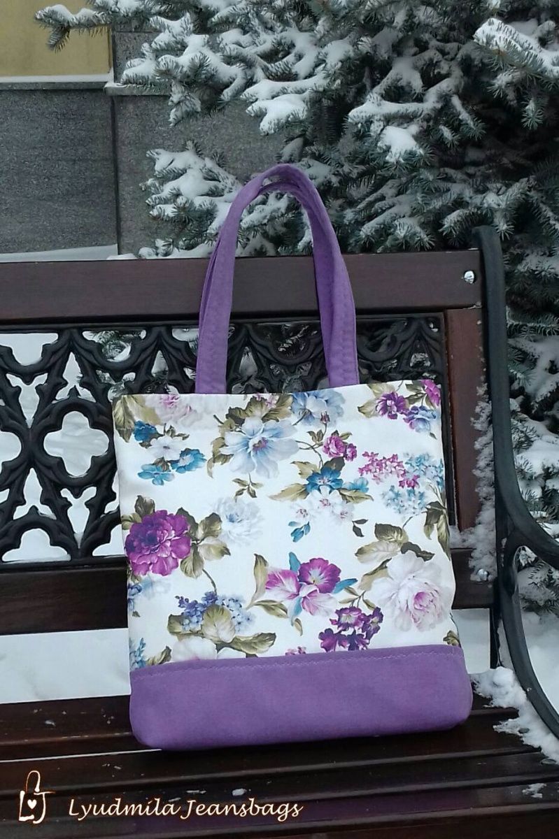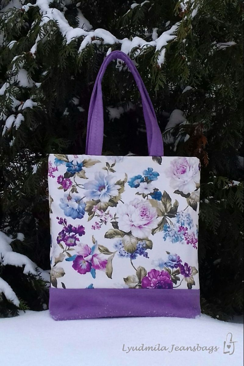 Легкое весеннее настроение всегда с собой. Сумка ручной работы состоит из 3-х слоев: верхний - плотная ткань с цветочным принтом; средний - джинс, благодаря которому изделие держит форму; подкладка - коттон насыщенного фиолетового цвета. Внутри три кармана. Сумка оснащена магнитной кнопкой. Донышко оформлено плотной приятной на ощупь тканью сиреневого цвета, а также дополнительно уплотнено изнутри для того чтобы сумка держала форму. Ручки выполнены из той же сиреневой материи. Верхний край сумки, ручки, дно, а также внутренние карманы декорированы фигурными строчками. Сумку можно носить в руке или на плече.