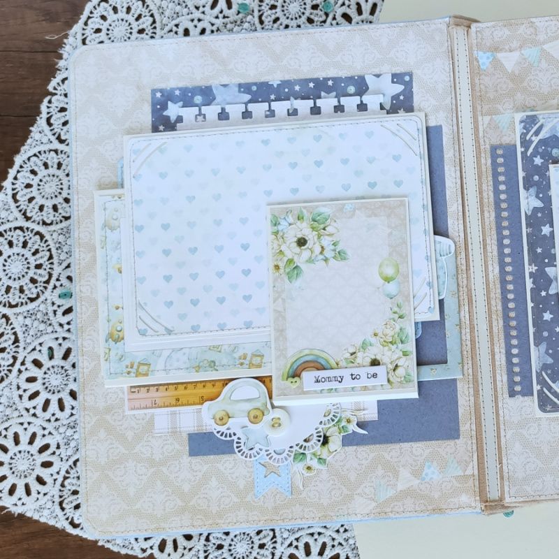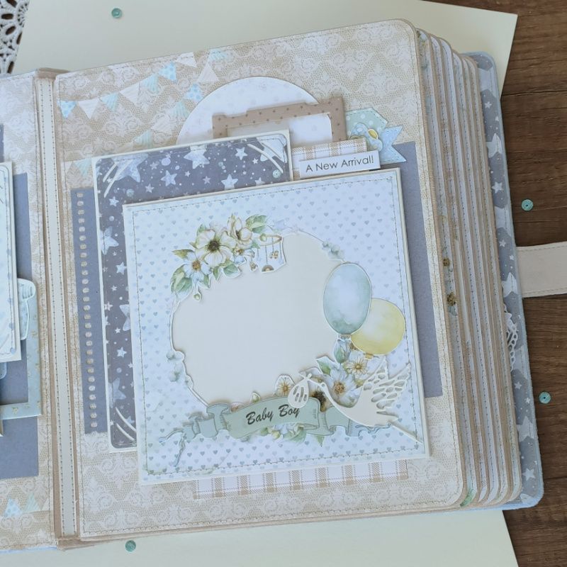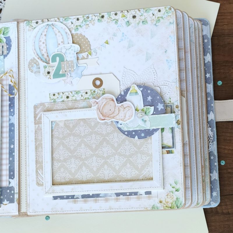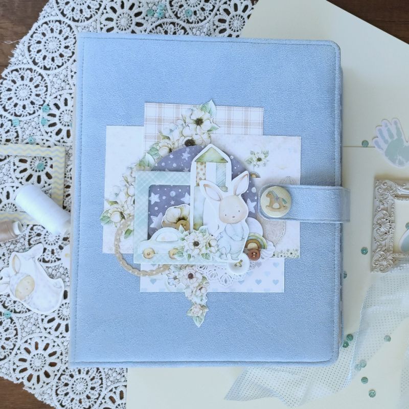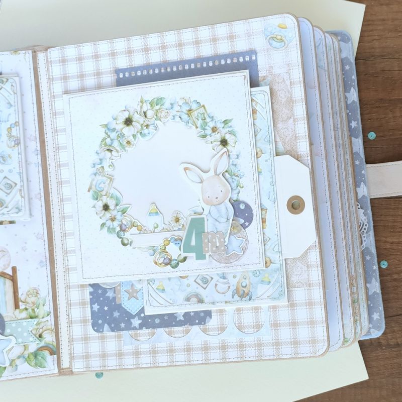 Детский фотоальбом предназначен для хранения фото с первого года ребенка и разных памятных мелочей. Первые страницы фотоальбома расскажут о волшебном времени беременности и появлении на свет малыша. Каждая следующая страница рассказывает о том, как взрослел ребенок в течение года. Почти на каждой странице есть места для подписей и карманчики для дополнительных фото или разных памятных мелочей. Альбом достаточно большой (27х22см) и объемный (8 разворотов), вмещает более 70 фотографий. Обложка альбома обтянута мягкой тканью с фактором замши и украшена бумажным декором.