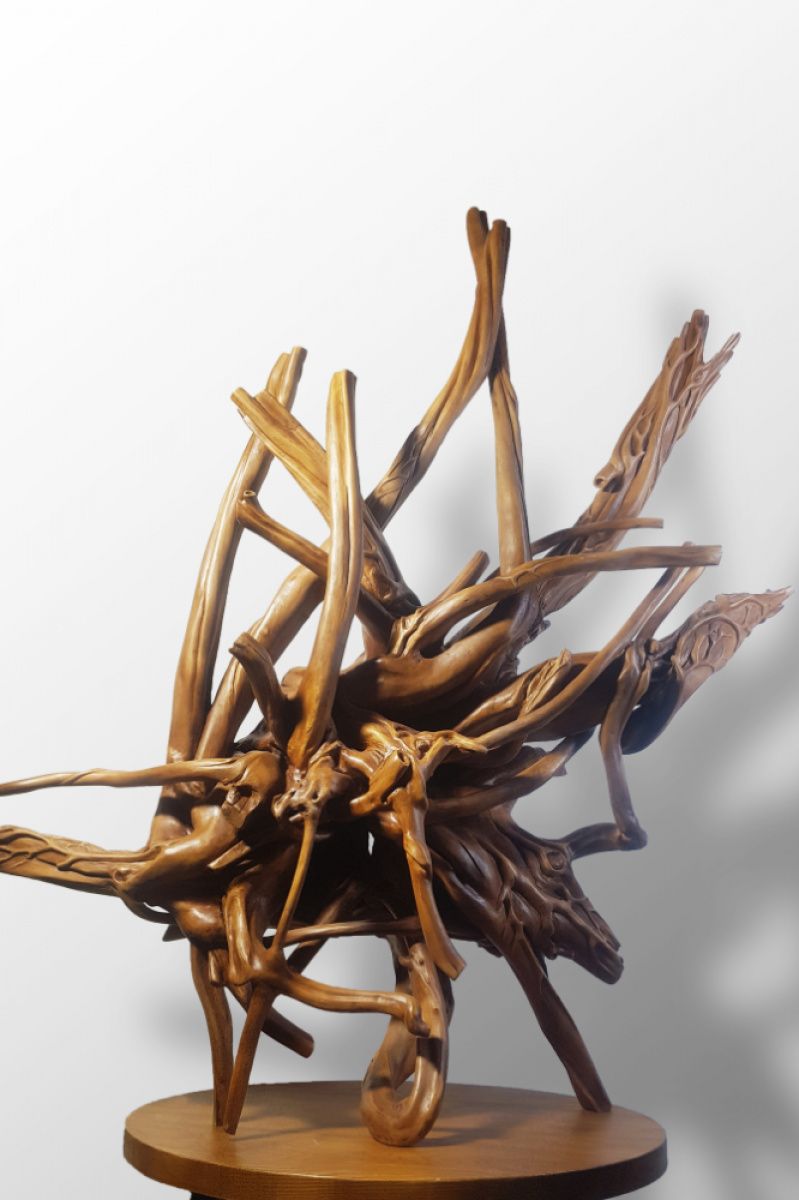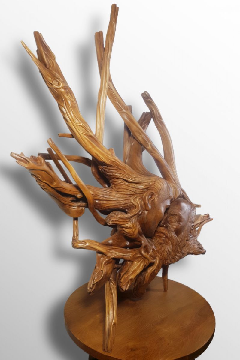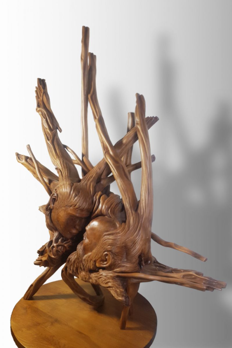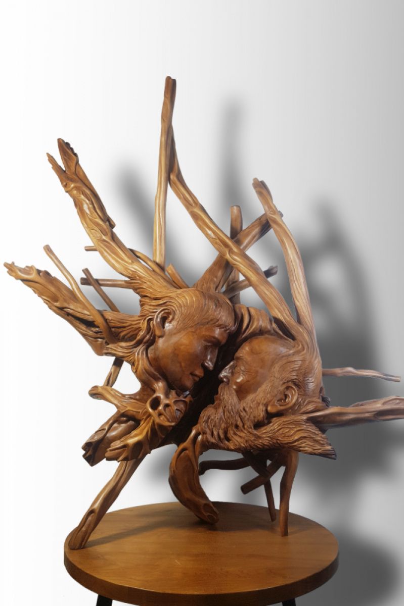 Деревянная скульптура под названием «Молодость и старость». Художественная композиция ручной работы выполнена из корня дерева яблони, и потому уникальна в своём роде и практически неповторима.