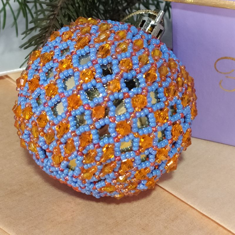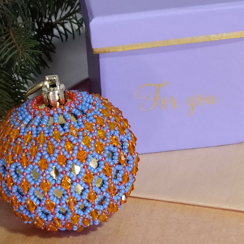 Яркое украшение к празднику, оригинальный подарок коллеге или дорогому человеку. Новогодняя игрушка ручной работы. Декорирована в технике бисероплетения бисером и бусинами. Диаметр шара 7 см. Каждая игрушка упаковывается в подарочную коробку.
