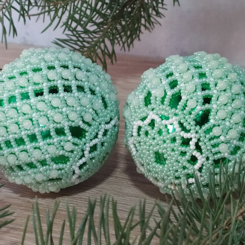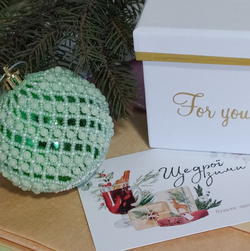Яркое украшение к празднику, оригинальный подарок коллеге или дорогому человеку. ⠀ Новогодняя игрушка ручной работы. Задекорирована в технике бисероплетения бисером и флуоресцентными бусинами, светящимися в темноте. Чем больше такая бусина поглотит света, тем интенсивнее и дольше светится в темноте. Диаметр шара 7 см. ⠀ Каждая игрушка упаковывается в подарочную коробку.