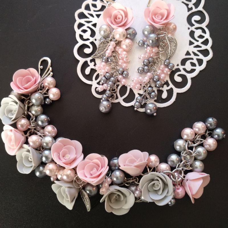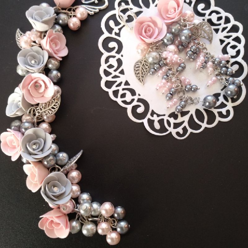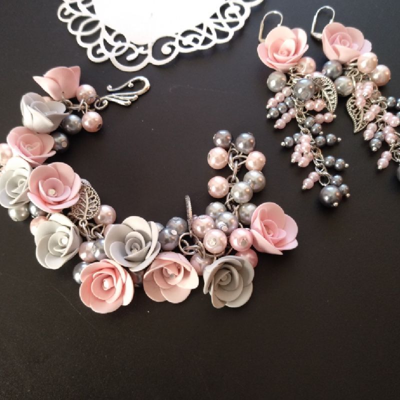 Нарядное украшение браслет и серьги с розовым и серебристо серым жемчугом . Розы розовые и светло-серые в вылеплены из полимерной бельгийской глины украшение сделано в пастельно розово серых тонах. Серебристая фурнитура не тускнеет. Розы прочные не боятся воды авторское украшение ручной работы. Длина браслета 16 19 см под заказ длина серёжек от 4 до 6 см под заказ.