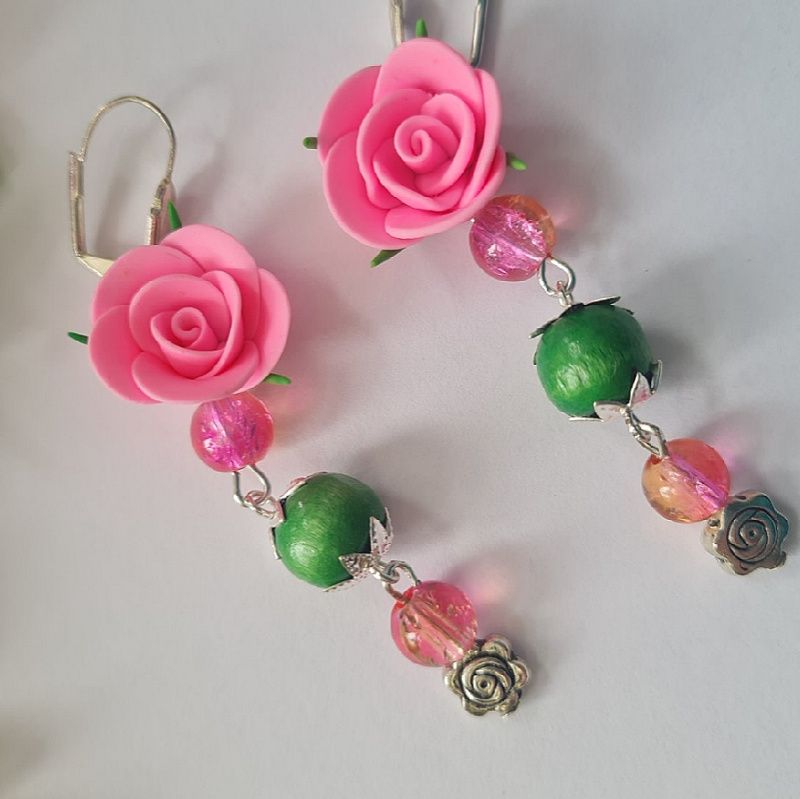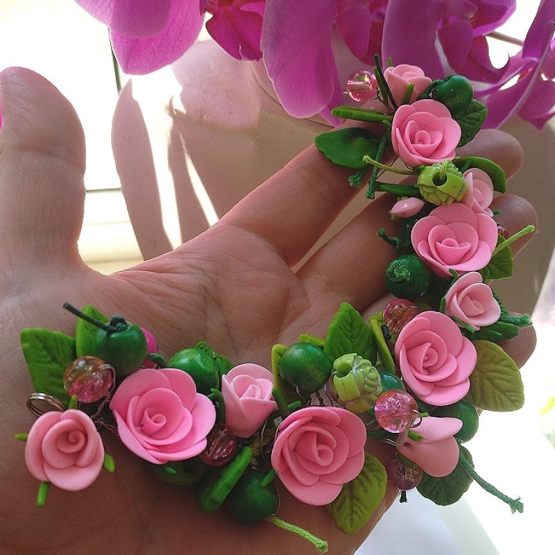 Пышный, объемный браслет и серьги с малиновыми и розовыми розами. Зелеными и салатовым листочками. Малиново розовые бусины из чешского стекла кракле. Авторский сборник, дизайн украшения, лепка. Украшение очень нарядное, весенне летняя украшение.
