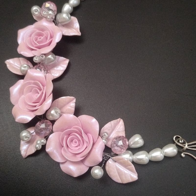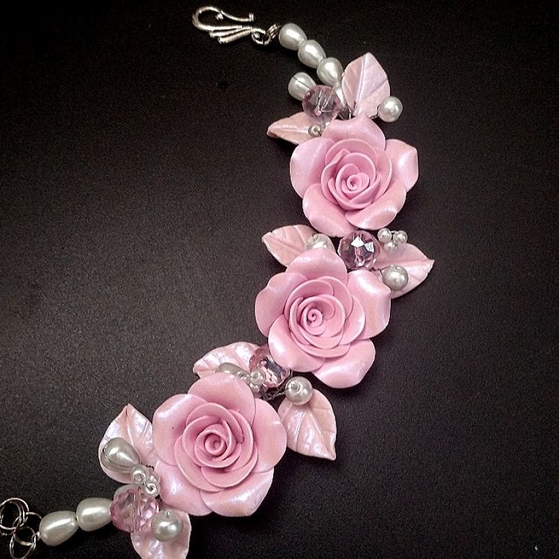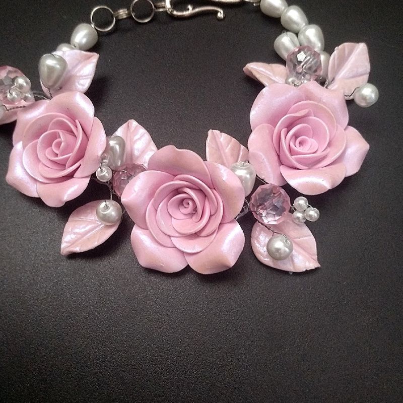 Браслет с перламутровыми розами из полимерной бельгийской глины. Авторское украшение ручной работы. Очаровательное украшение из роз ручной работы, изумительного грушеводного жемчуга Майорки, хрустальных розовых кристаллов. Цвет украшения сиренево розовый. Покрыт перламутром, при различном освещение цвет меняется. От бледно розового до нежно голубого. Браслет подходит под колье жемчужная нежность
