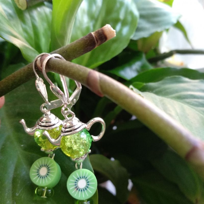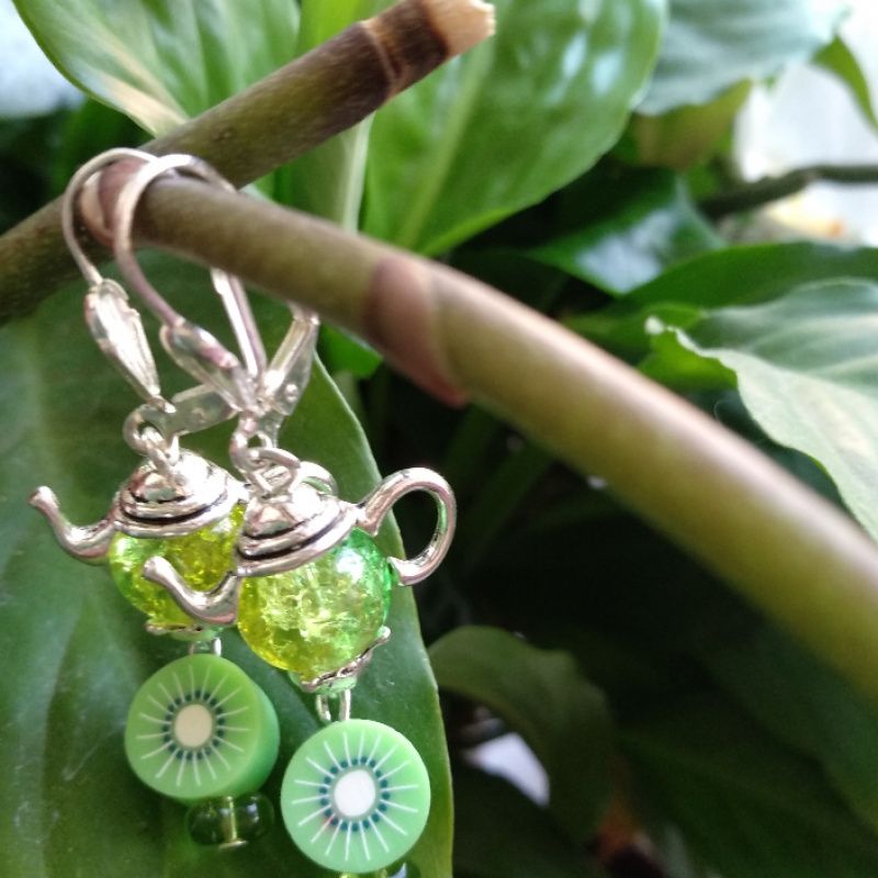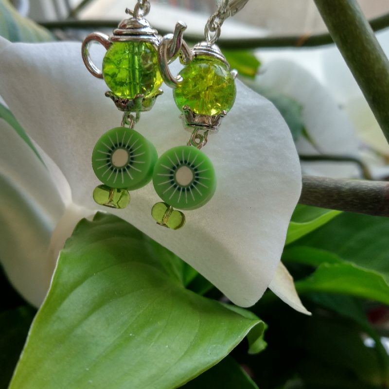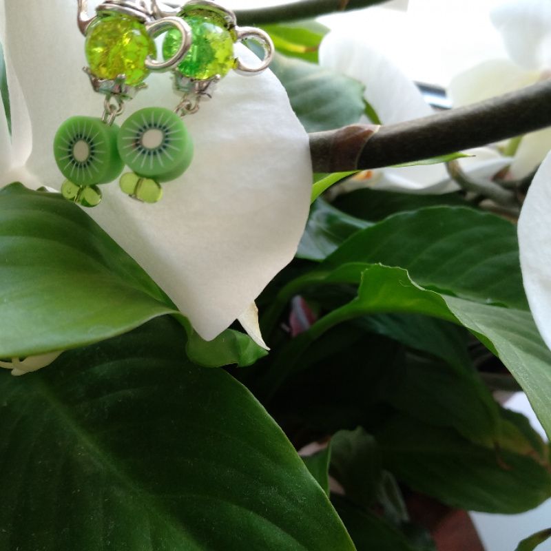 Необычные серьги с яркими салотово зелёными бусинами чешского стекла кракле дольками спелого киви. Украшение под заказ.