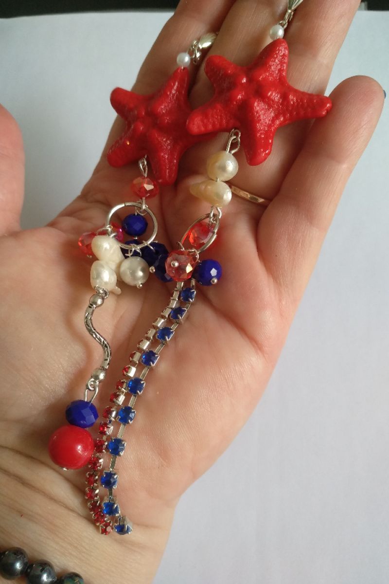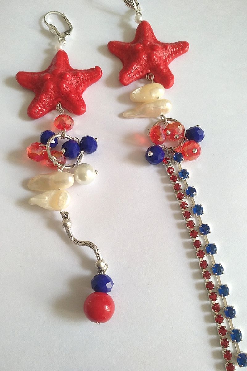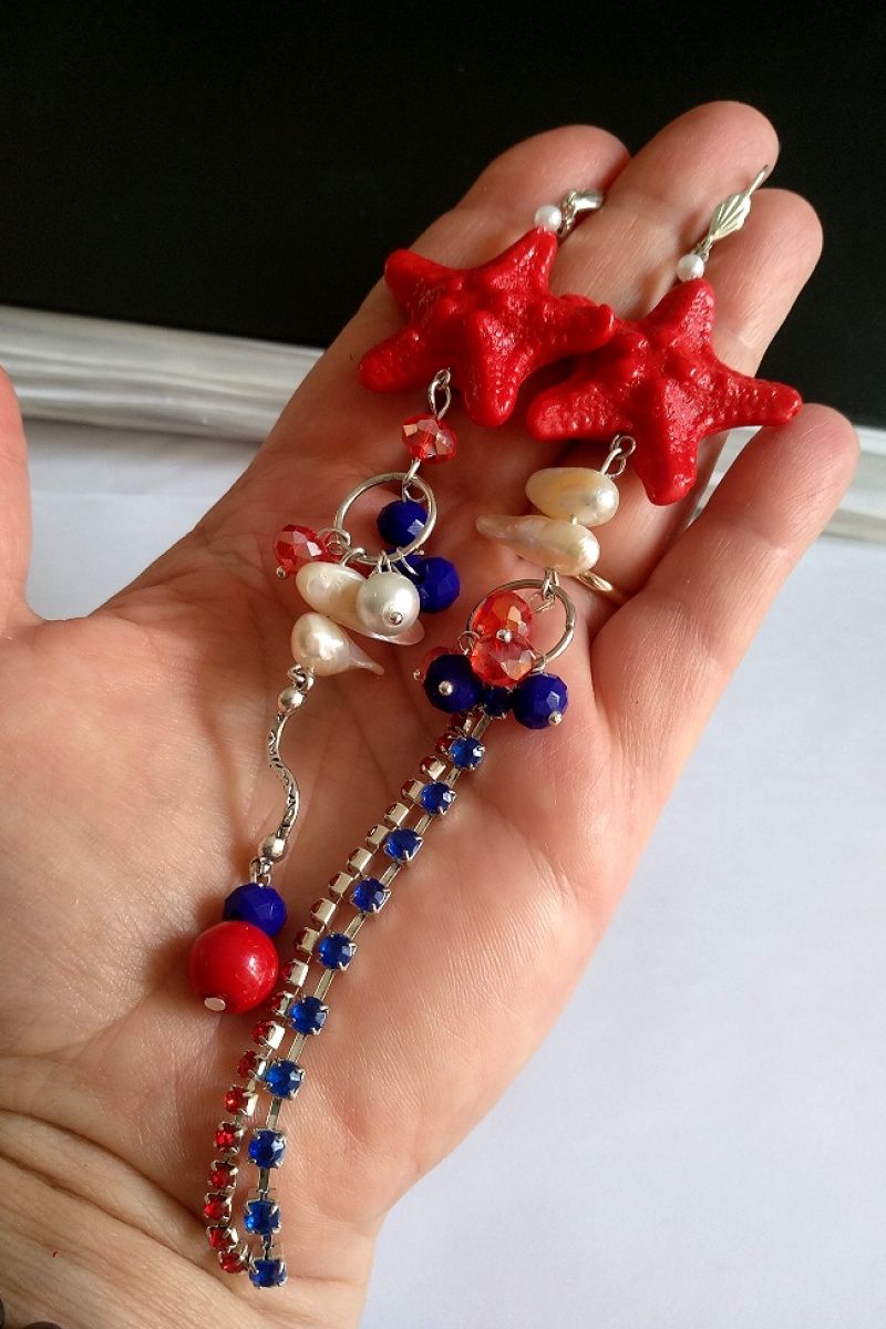 Красно синие серьги сделаны в морском стиле очень красивая яркая работа . Длинные серьги звёзды вылеплены из полимерного бельгийского пластика, в работе использован натуральный коралл жемчуг кешью стразовые цепи хрусталь