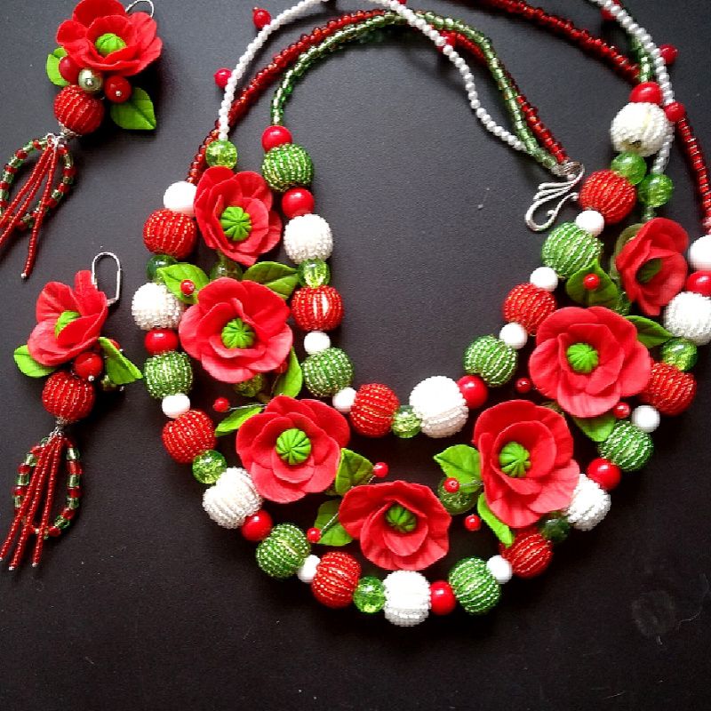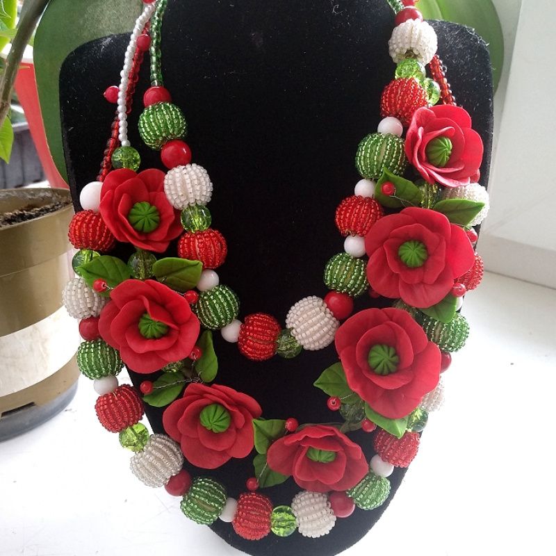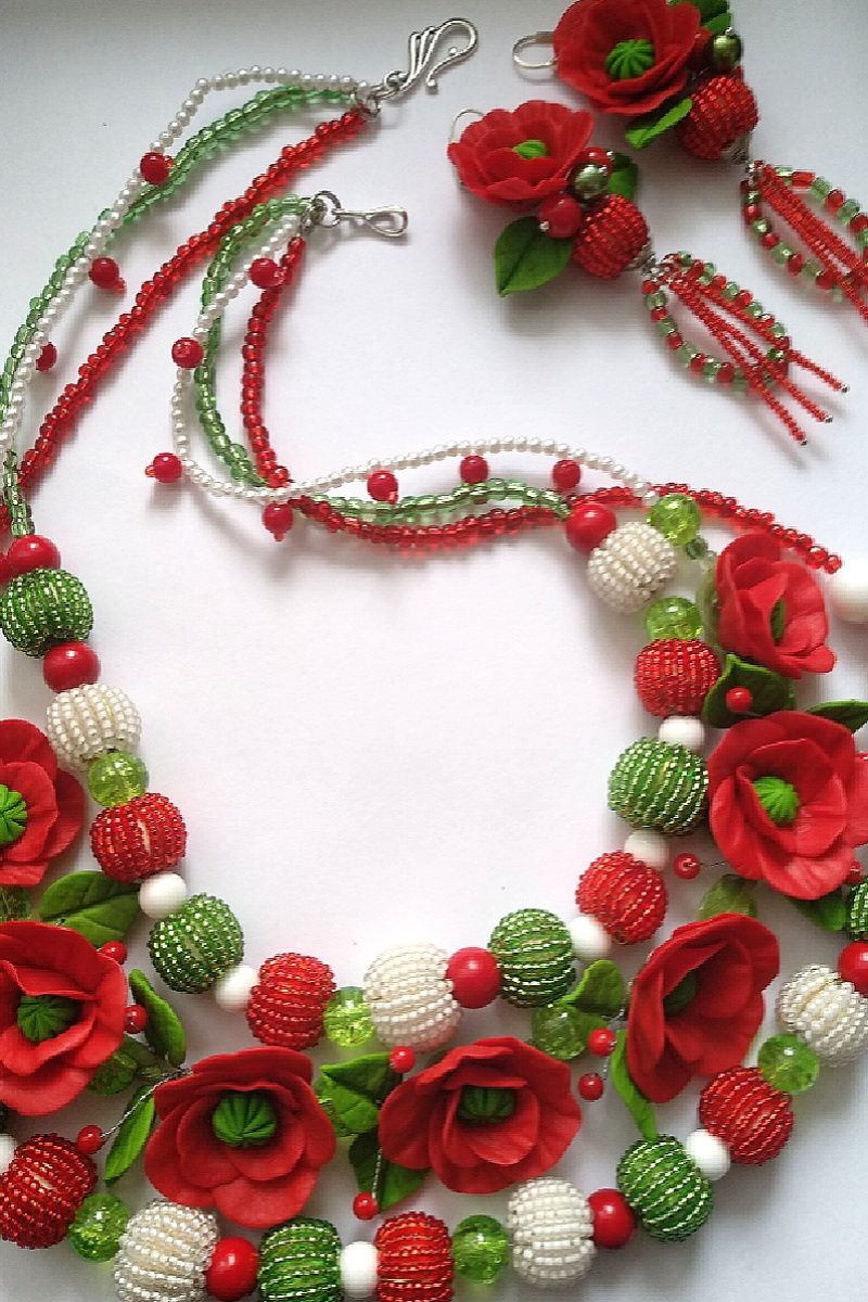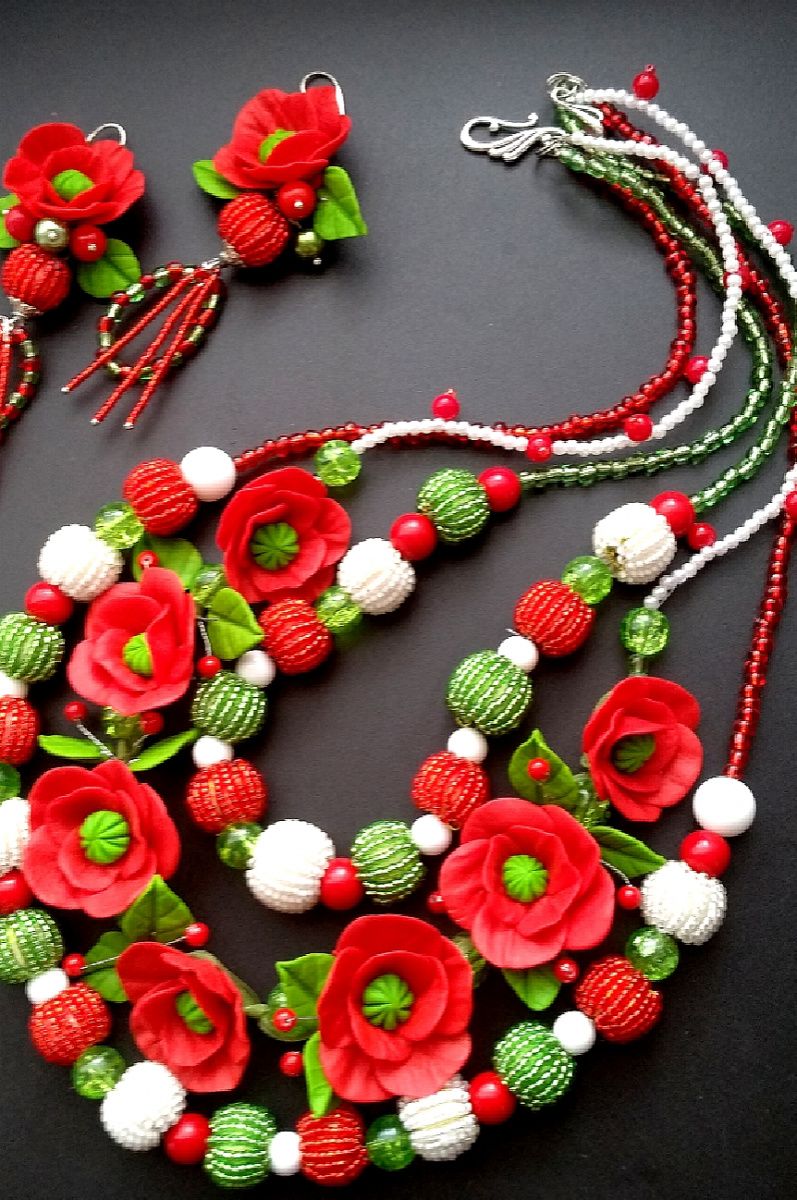 Роскошные длинные бусы с маками , листочками, бисерным шариками. Авторское украшение из полимерной бельгийской глины. Яркие маки,, ярко зелёные листочки. Длинные серьги 7см, длинные бусы 60см. Украшение для фотосессии, праздника, свадьбы, сценического образа .Подарок роскошной женщине. При заказе украшения учитывайте срок выполнения работы 14днец