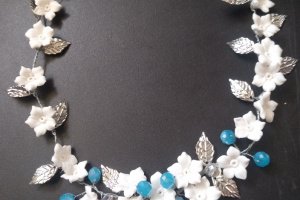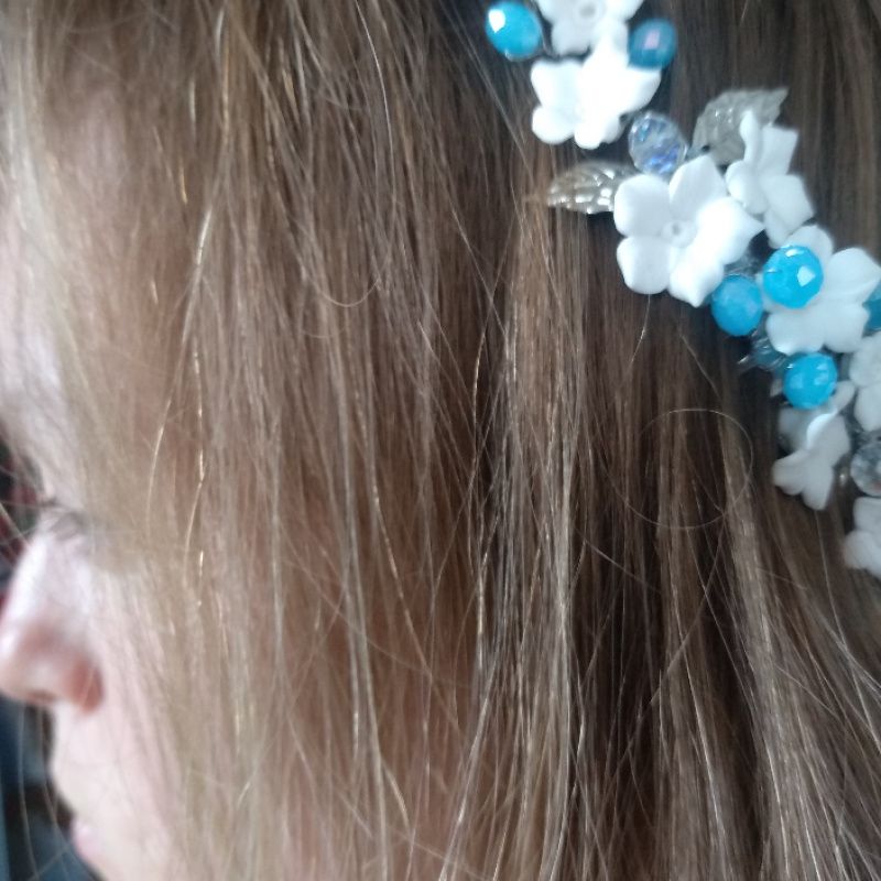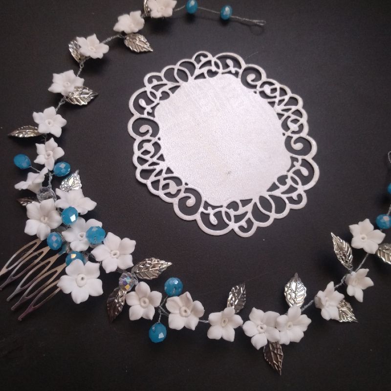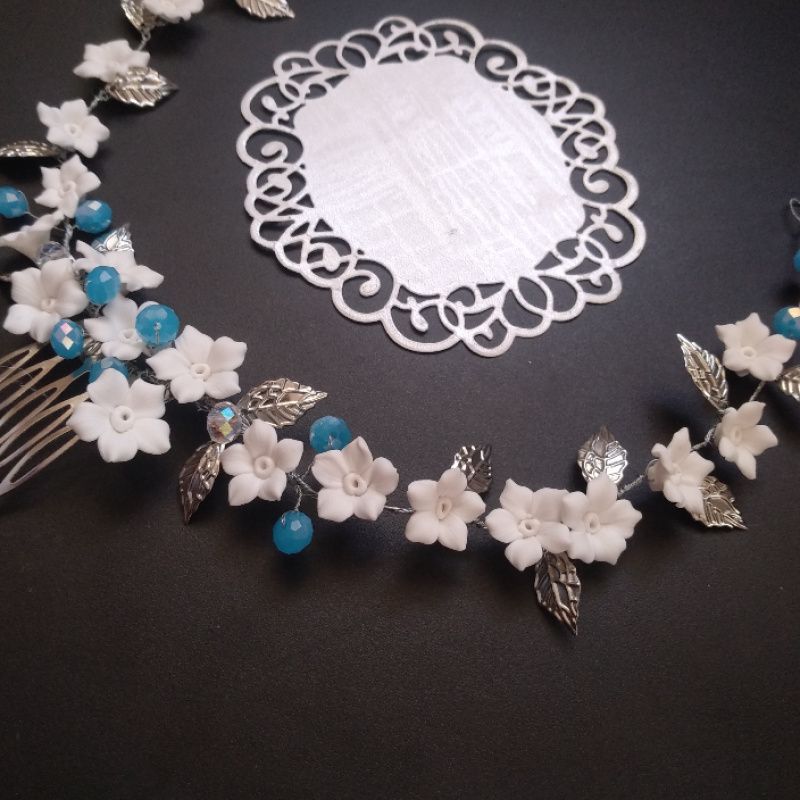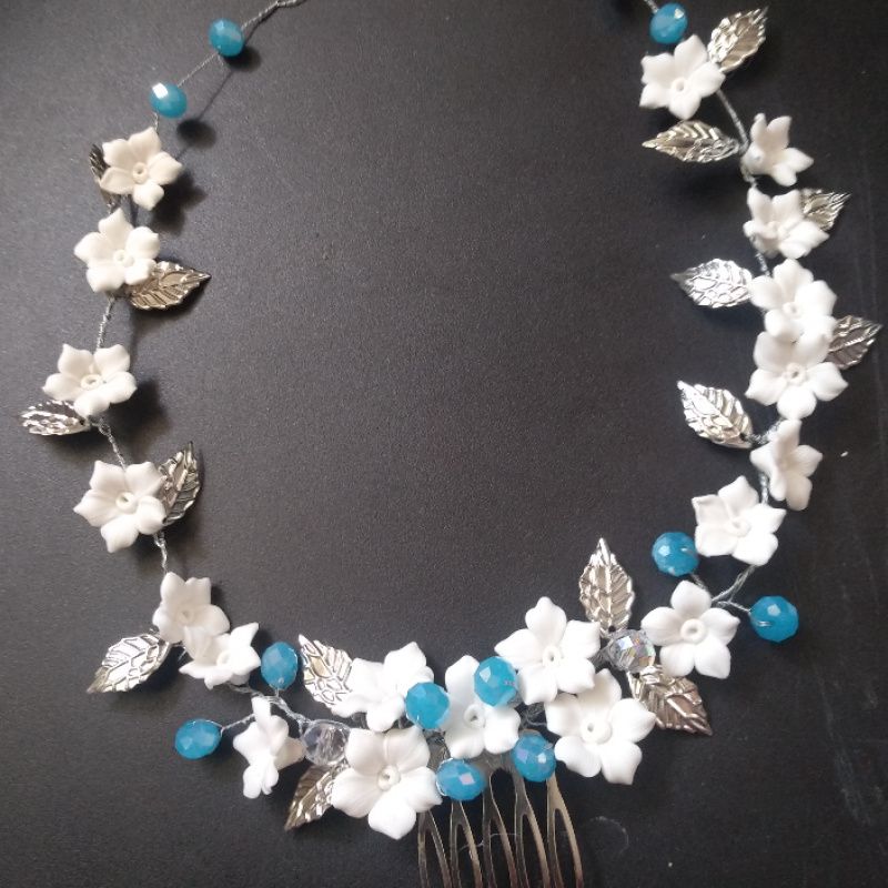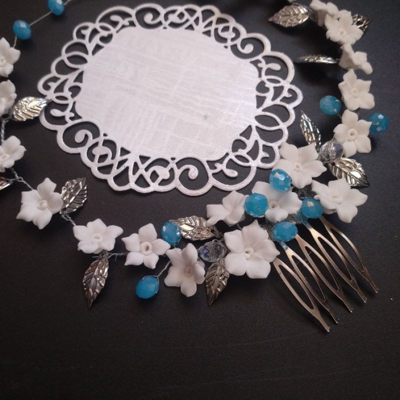 Очаровательно свадебные веточки на гребне длина веточки 21см. Длина гребня 5 см. Небольшие очаровательные цветочки мелким жемчугом серебристые листочки очень красивые голубые хрустальные камни. Авторское украшения ручной работы из полимерной бельгийской глины, под заказ. Украшения из новой испанской коллекции 2021 года