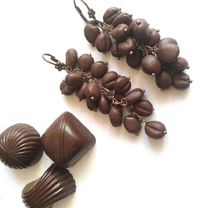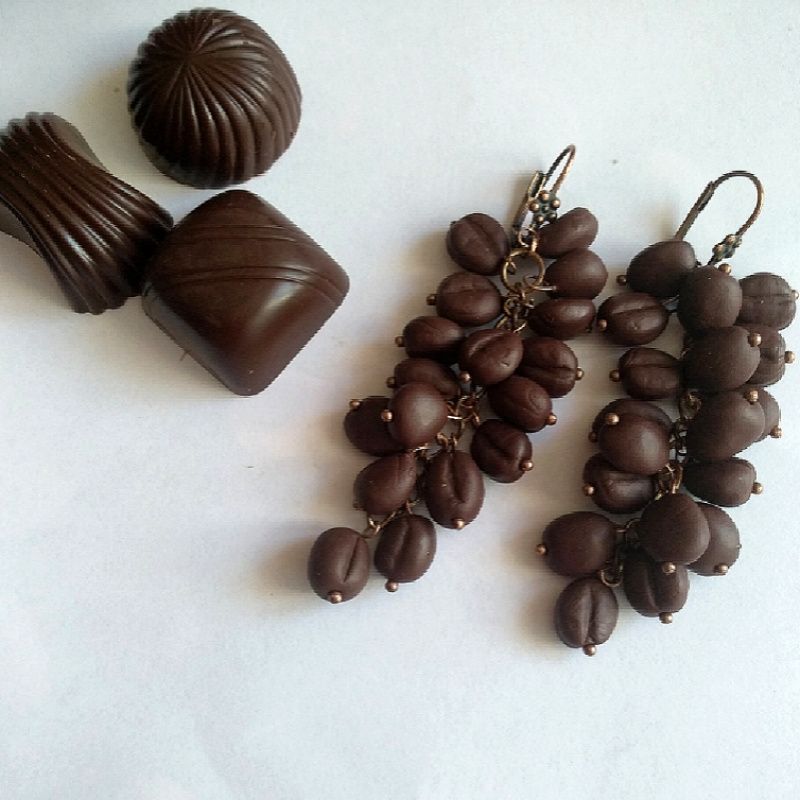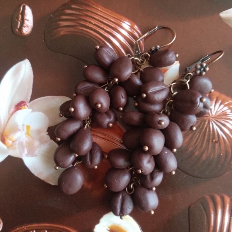Необычные серьги с кофе, на винтажной бронзовой фурнитуре. Авторская ручная работа. Зерна кофе вылеплены вручную. Серьги реалистичны, не отличимы от зёрен кофе арабики.